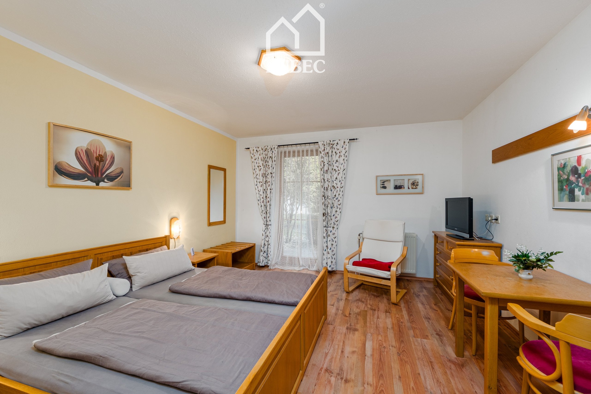 Apartmán se nachází v domě s rozlehlou, pečlivě udržovanou zahradou a nabízí společné wellness zázemí – saunu, bazének a relaxační místnost, kde si můžete dopřát odpočinek po aktivním dni.