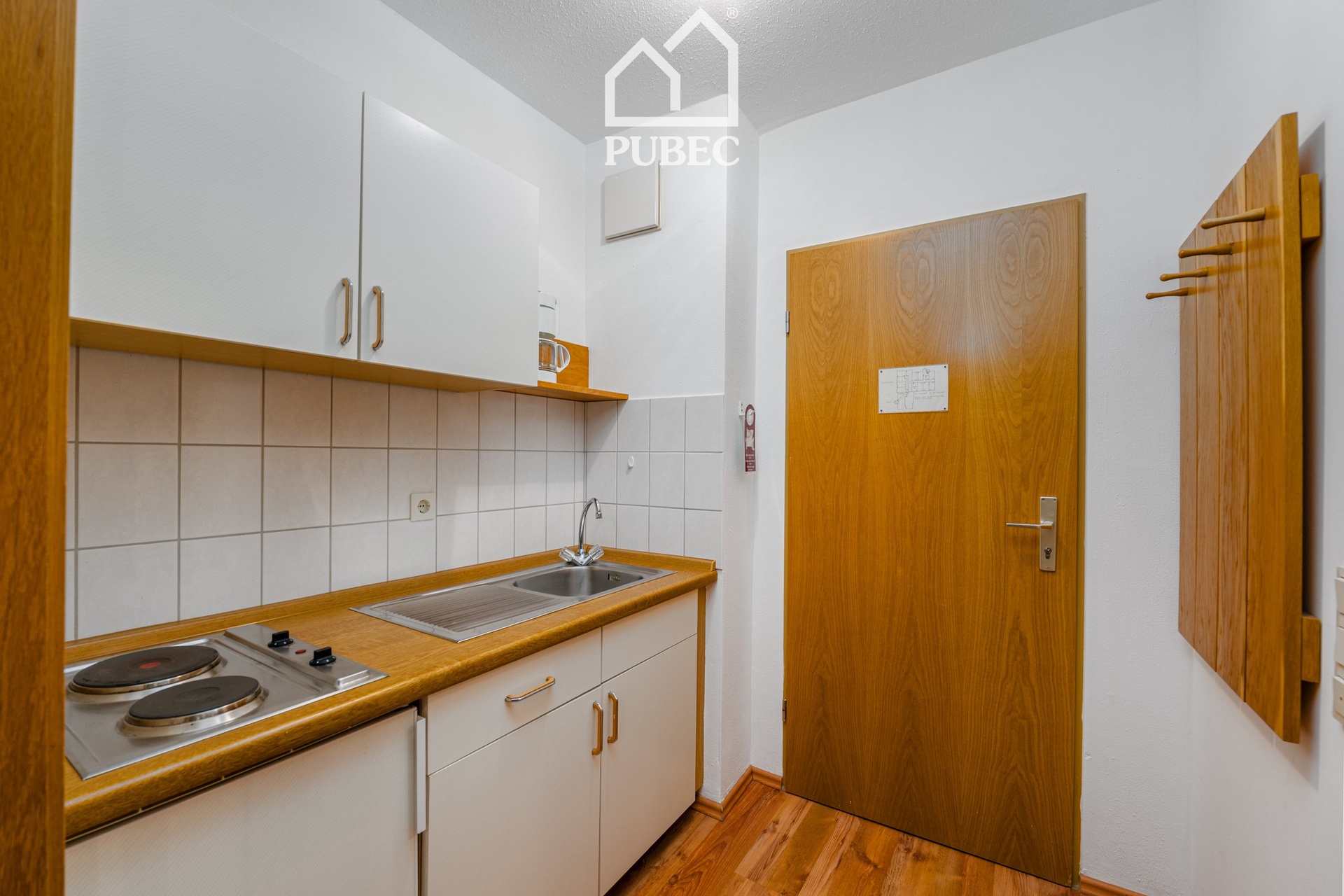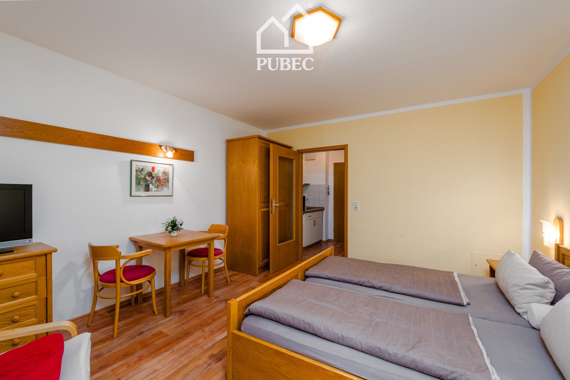 Dispozice zahrnuje obytný pokoj s přímým vstupem na terasu ( 10 m² ) do zahrady, kuchyňský kout a koupelnu s WC. Ohřev vody i vytápění je řešeno centrálně z domovní kotelny. K dispozici je internet, satelitní i kabelová TV.