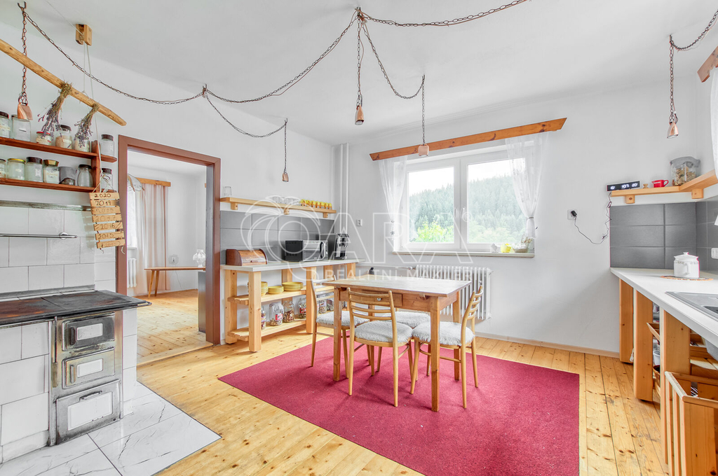 Interiér domu působí útulně a přirozeně. K dispozici je pět prostorných pokojů, kuchyně s jídelnou a moderní koupelna. V obytných místnostech jsou dřevěné palubky, v chodbě, předsíni a koupelně keramická dlažba. Výrazným prvkem kuchyně jsou původní plně funkční kachlová kamna, která prostoru dodávají teplo a charakter a vytvářejí příjemnou atmosféru zejména v chladnějších měsících.