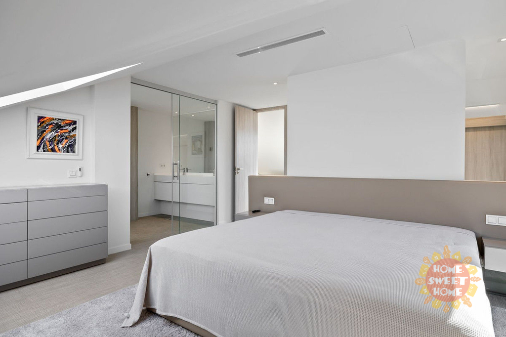 V patře se nachází hlavní ložnice a koupelna, které nabízejí více než 40 m2 luxusu a výhled na okolní přírodu a moře. Přístup z obývacího pokoje přes dřevěné schodiště kombinující dřevo a sklo v otevřeném prostoru.