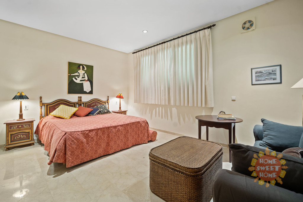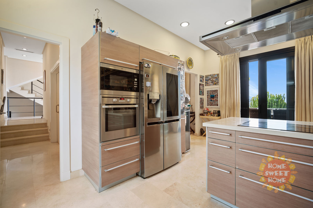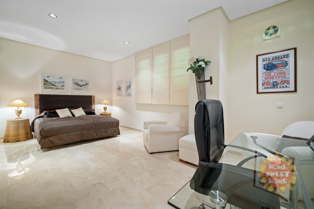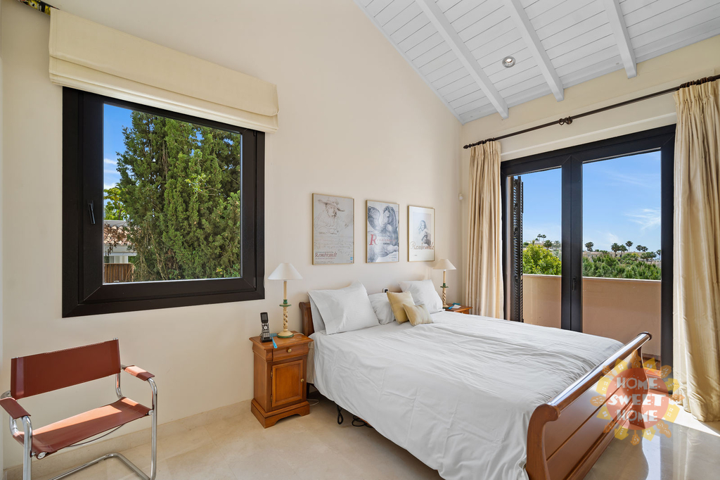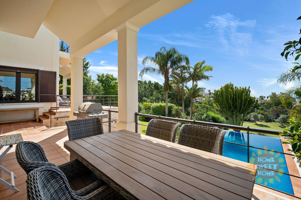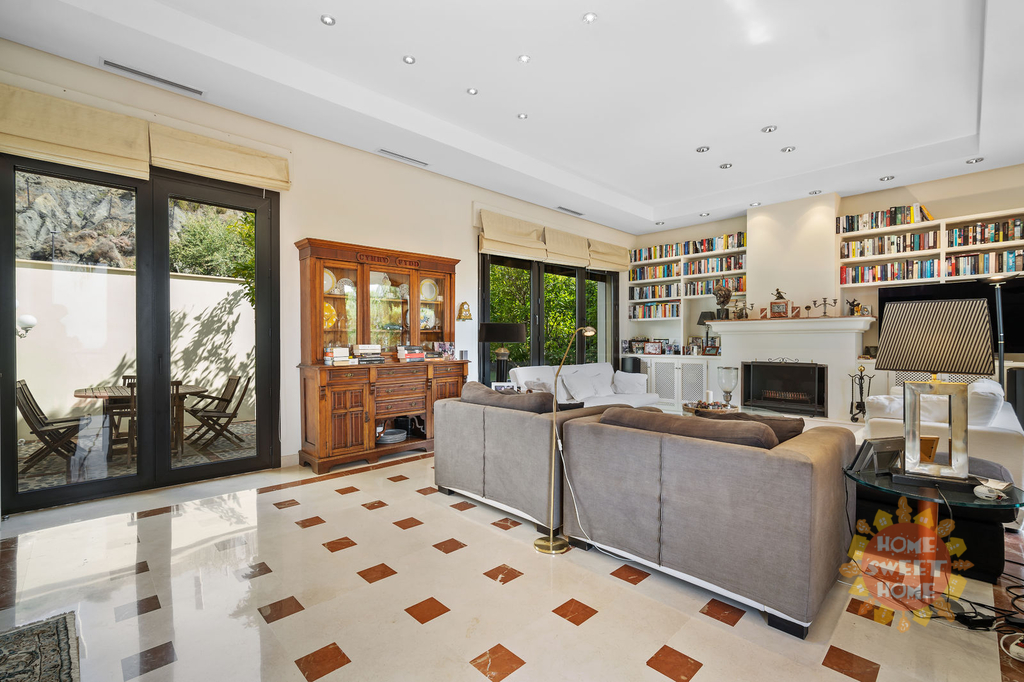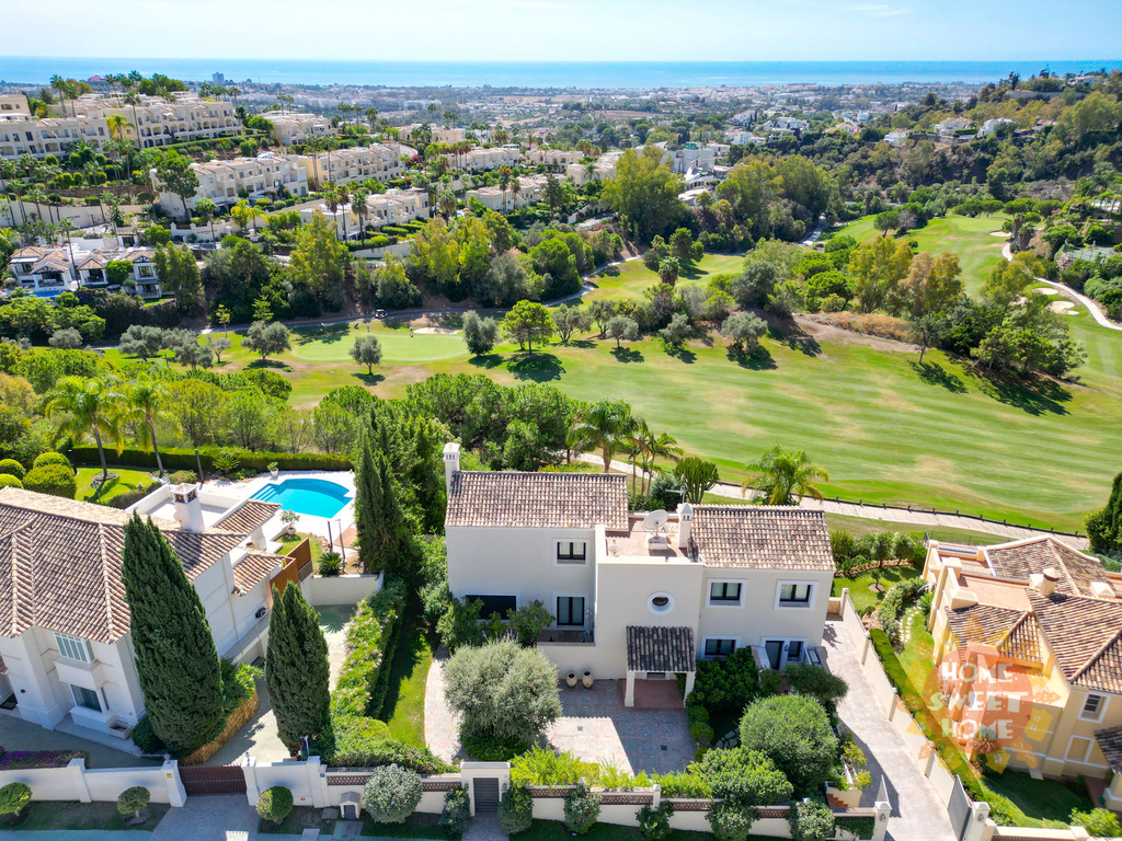 Fantastická vila s pěti ložnicemi a jižní orientací v lokalitě La Quinta, Benahavis. Vila se nachází v jen kousek od místní občanské vybavenosti a měst Puerto Banus a Marbella. Nemovitost má v přízemí prostornou vstupní halu vedoucí do velkého obývacího pokoje, plně vybavenou kuchyň a jídelnu, a toaletu pro hosty. Ze všech místností na této úrovni je přístup na terasu, do soukromé zahrady a k bazénu, od kus nabízí krásný výhled na moře a golfové hřiště. V prvním patře se nachází hlavní ložnice s klenutými stropy, šatnou a koupelnou, dvě ložnice pro hosty a koupelna pro hosty. Ve spodním patře nemovitosti se nachází kuchyň a jídelna s nezávislým přístupem ze zahrady, dva pokoje pro hosty a kinosál. K dalšímu vybavení vily patří klimatizace s funkcí topení a chlazení, alarm, elektrické žaluzie a garáž.