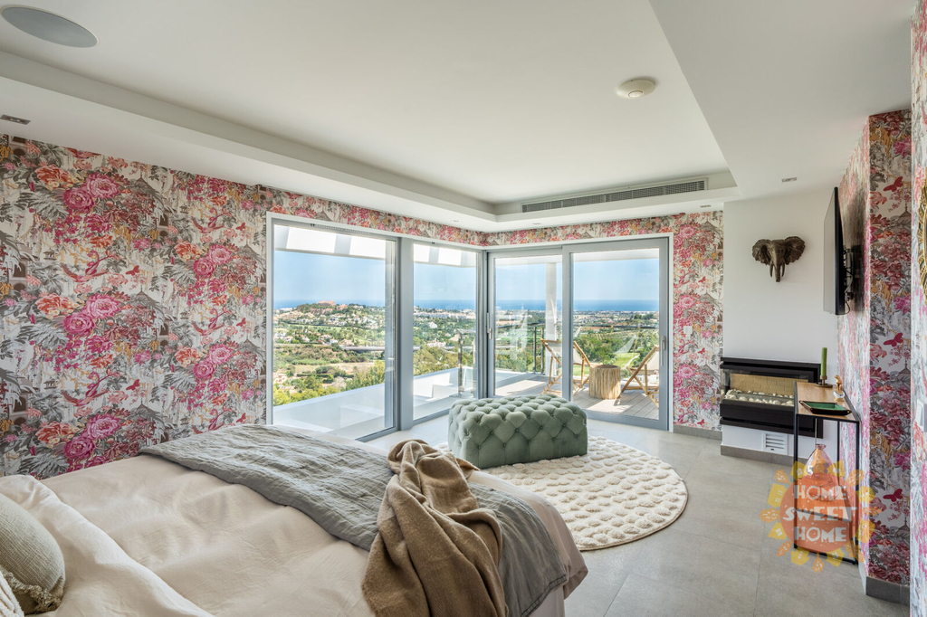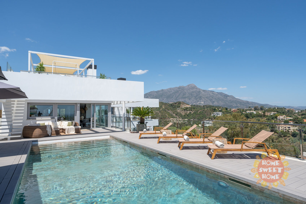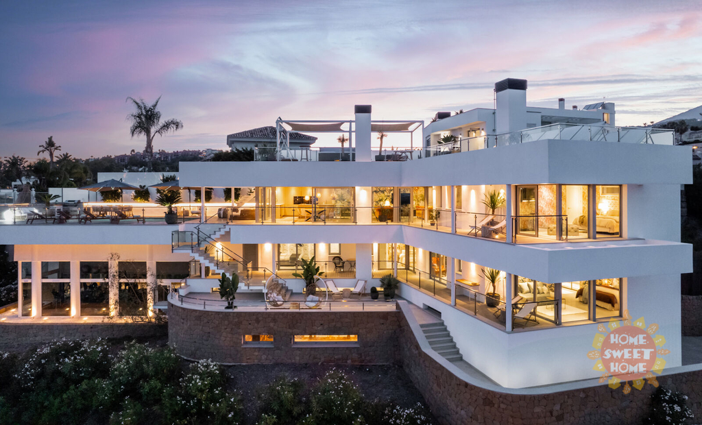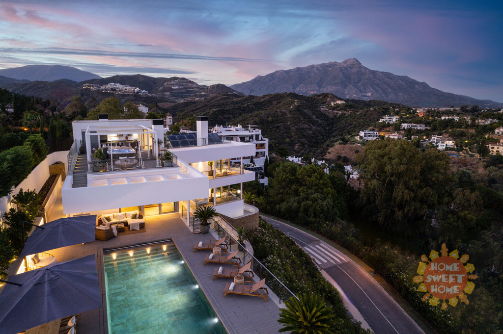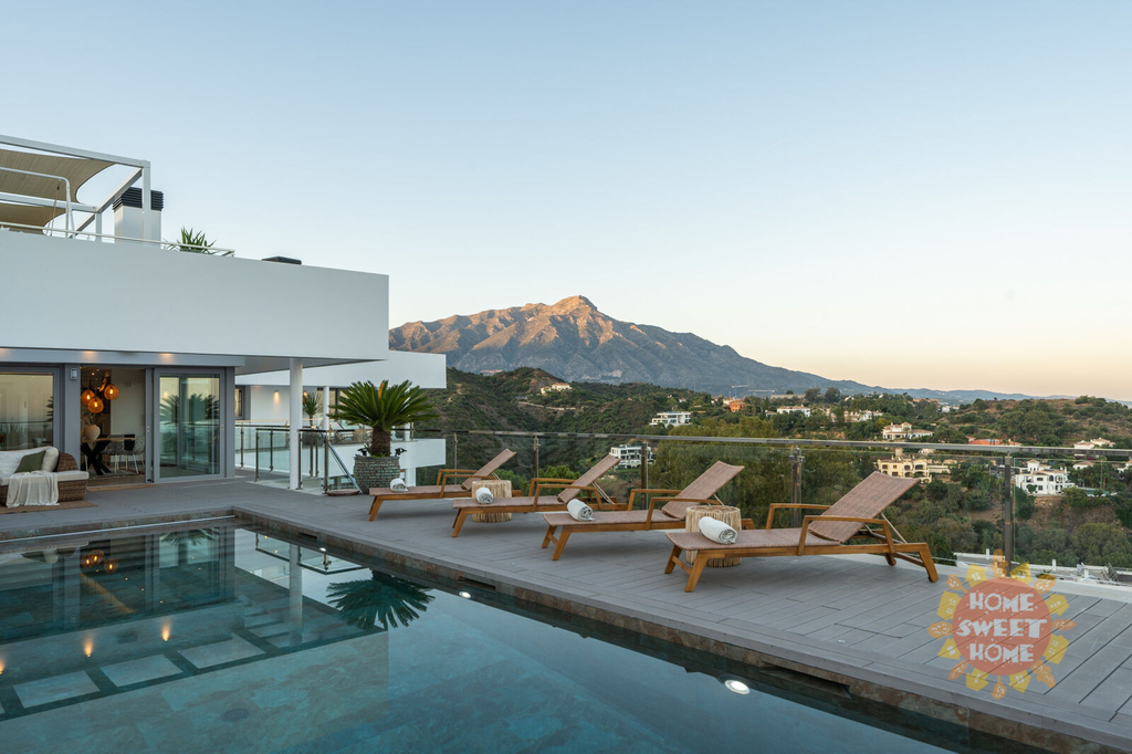 Elegantní vila s 5 ložnicemi a jižní orientací v exkluzivním golfovém resortu La Quinta. Prestižní poloha, nádherný panoramatický výhled, vynikající moderní design a luxusní vybavení. Prestižní La Quinta se skládá z několika menších urbanizací, budete mít přístup k fantastické nabídce rekreačních zařízení, 27jamkovému golfovému hřišti, golfové akademii, restauracím, barům a kavárnám, SPA, posilovně atd. V sousedství golfového hřiště se nachází 5* hotel Westin La Quinta Golf Resort & Spa, který patří mezi 5 nejlepších v regionu. Veškerá občanská vybavenost Nueva Andalucia, Puerto Banus, San Pedro a centra Marbelly je vzdálena několik minut jízdy autem. Z vily je neuvěřitelný výhled na Středozemní moře, legendární horu La Concha a smaragdově zelená golfová hřiště. Horní patro (4.) vybízí k vychutnávání výhledů na moře, hory a golf ze solária s vířivkou. Ve 3. patře se nachází nádherná terasa s venkovní kuchyní a grilem, vyhřívaný bazén se slanou vodou a stejně úchvatný výhled jako ze solária. Obývací pokoj s jídelnou, vyzařující luxus a pohodlí, je propojen s otevřenou a plně vybavenou elegantní kuchyní se spotřebiči Miele. Z této části je přímý vstup na terasu a k venkovnímu bazénu. Hlavní apartmá má etanolový krb, luxusní koupelnu se šatnou a terasu, kde si můžete dát ranní kávu a obdivovat nádherný výhled. Ve 2. patře se nachází technická místnost a dvě ložnice apartmá pro hosty s přístupem na terasu. Další 2 ložnice pro hosty s vlastní koupelnou a terasou najdete v 1. patře. V přízemí najdete vše, co potřebujete k péči o své zdraví a pohodu, včetně SPA-prostoru, krytého vyhřívaného bazénu, sauny, tureckých lázní, posilovny, masážní místnosti a vinného sklípku. V garáži je místo pro dvě auta. Výtah bez námahy spojuje všechna patra domu.