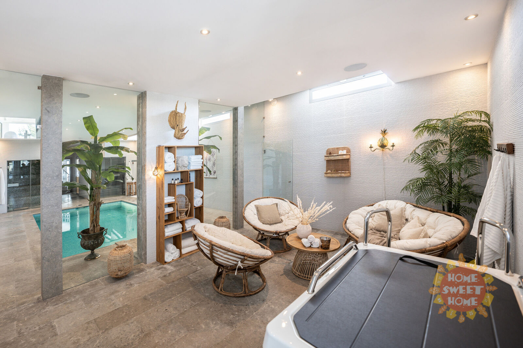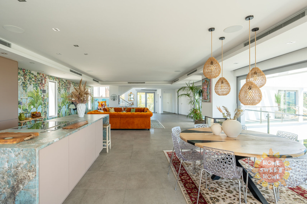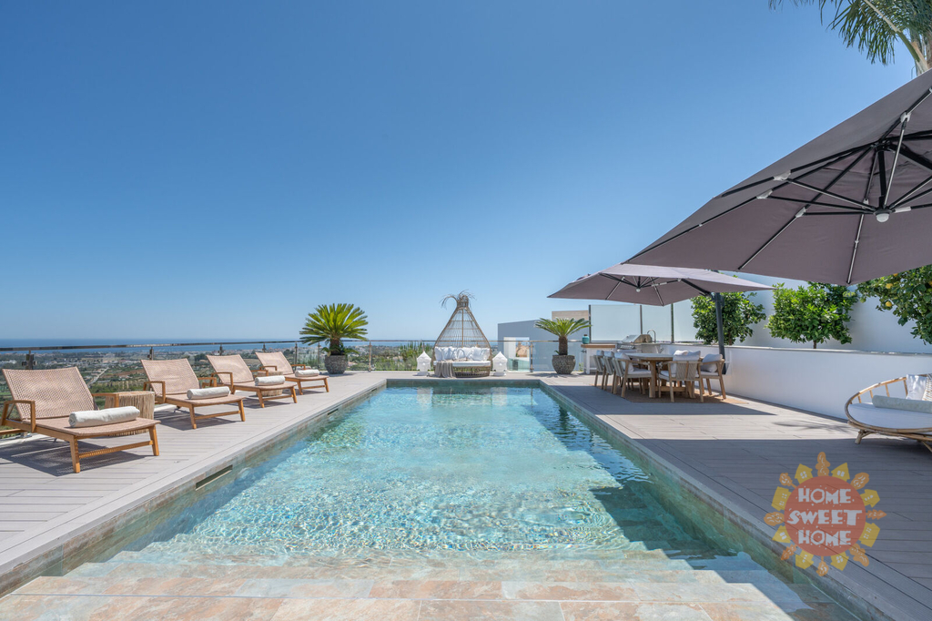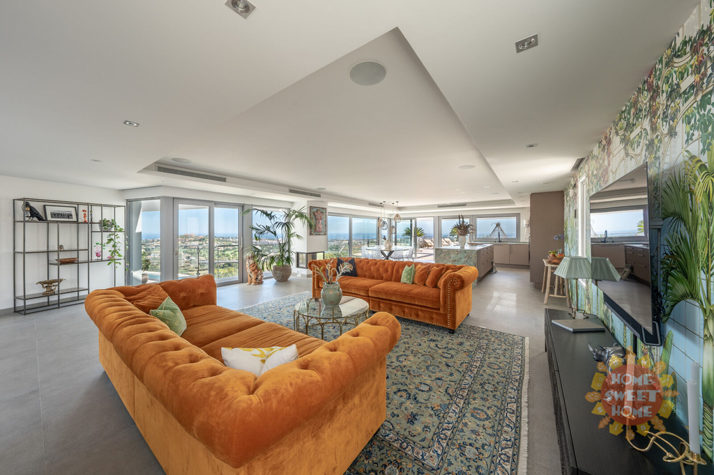 Elegantní vila s 5 ložnicemi a jižní orientací v exkluzivním golfovém resortu La Quinta. Prestižní poloha, nádherný panoramatický výhled, vynikající moderní design a luxusní vybavení. Prestižní La Quinta se skládá z několika menších urbanizací, budete mít přístup k fantastické nabídce rekreačních zařízení, 27jamkovému golfovému hřišti, golfové akademii, restauracím, barům a kavárnám, SPA, posilovně atd. V sousedství golfového hřiště se nachází 5* hotel Westin La Quinta Golf Resort & Spa, který patří mezi 5 nejlepších v regionu. Veškerá občanská vybavenost Nueva Andalucia, Puerto Banus, San Pedro a centra Marbelly je vzdálena několik minut jízdy autem. Z vily je neuvěřitelný výhled na Středozemní moře, legendární horu La Concha a smaragdově zelená golfová hřiště. Horní patro (4.) vybízí k vychutnávání výhledů na moře, hory a golf ze solária s vířivkou. Ve 3. patře se nachází nádherná terasa s venkovní kuchyní a grilem, vyhřívaný bazén se slanou vodou a stejně úchvatný výhled jako ze solária. Obývací pokoj s jídelnou, vyzařující luxus a pohodlí, je propojen s otevřenou a plně vybavenou elegantní kuchyní se spotřebiči Miele. Z této části je přímý vstup na terasu a k venkovnímu bazénu. Hlavní apartmá má etanolový krb, luxusní koupelnu se šatnou a terasu, kde si můžete dát ranní kávu a obdivovat nádherný výhled. Ve 2. patře se nachází technická místnost a dvě ložnice apartmá pro hosty s přístupem na terasu. Další 2 ložnice pro hosty s vlastní koupelnou a terasou najdete v 1. patře. V přízemí najdete vše, co potřebujete k péči o své zdraví a pohodu, včetně SPA-prostoru, krytého vyhřívaného bazénu, sauny, tureckých lázní, posilovny, masážní místnosti a vinného sklípku. V garáži je místo pro dvě auta. Výtah bez námahy spojuje všechna patra domu.