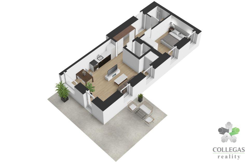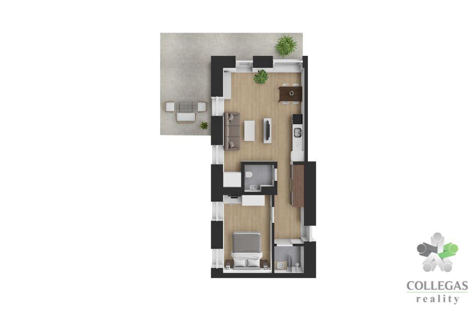 Apartmán s dispozicí 2+kk s se nachází v přízemí. K apartmánu patří terasa a dvě parkovací stání. V případě potřeby může být zajištěna také správa apartmánu.
