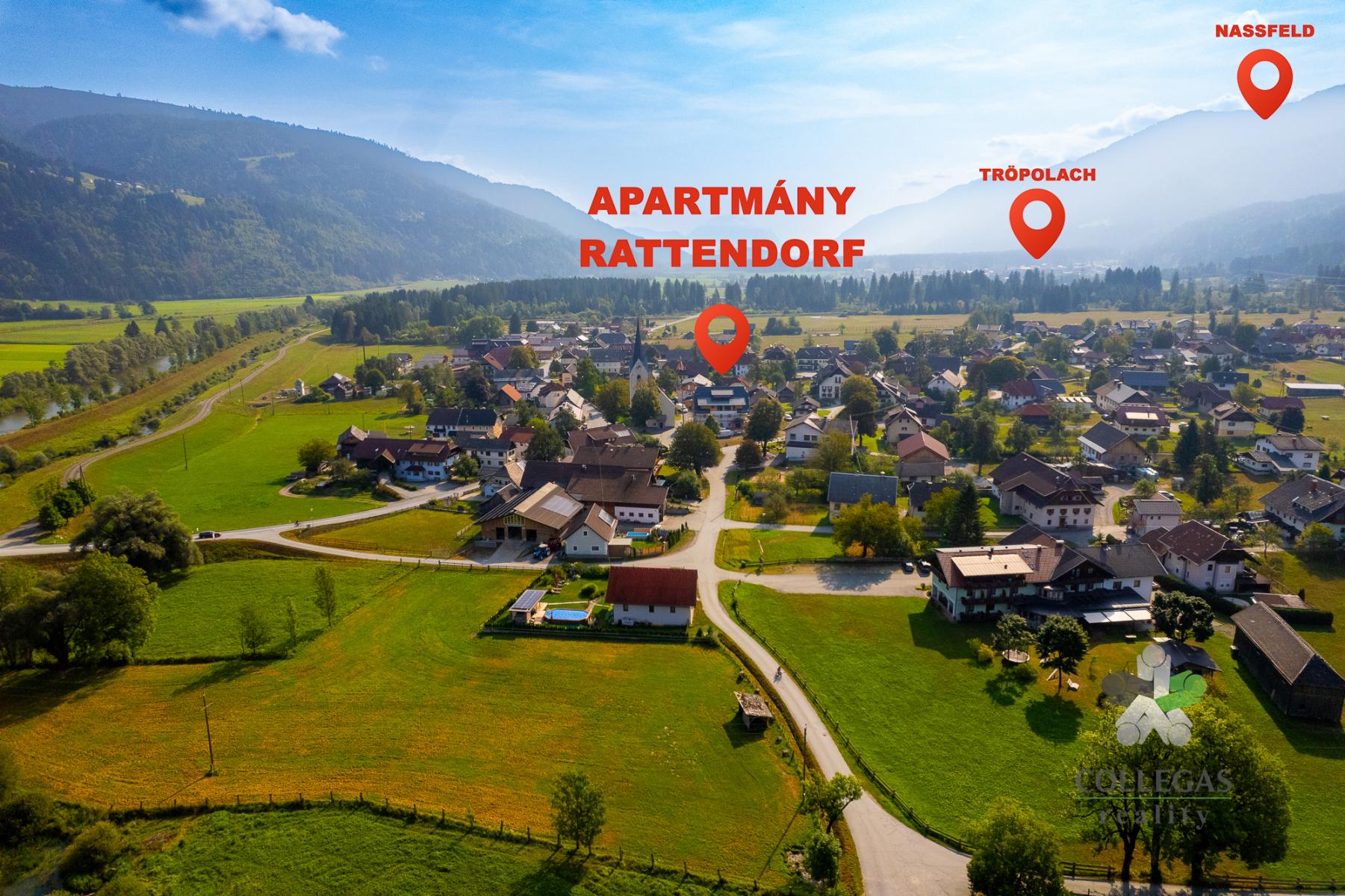 Apartmánový dům je v samém centru alpské obce Rattendorf, která se nachází v údolí Gailtal v regionu Korutany v těsné blízkosti hranice s Itálií. Krásná alpská krajina láká turisty po celý rok a rodinná atmosféra vesnice je ideální pro ty, kdo hledají únik z městského ruchu. Oblast nabízí spoustu příležitostí pro relaxaci a wellness, výlety za historií či kulturou nebo gastronomické zážitky.
