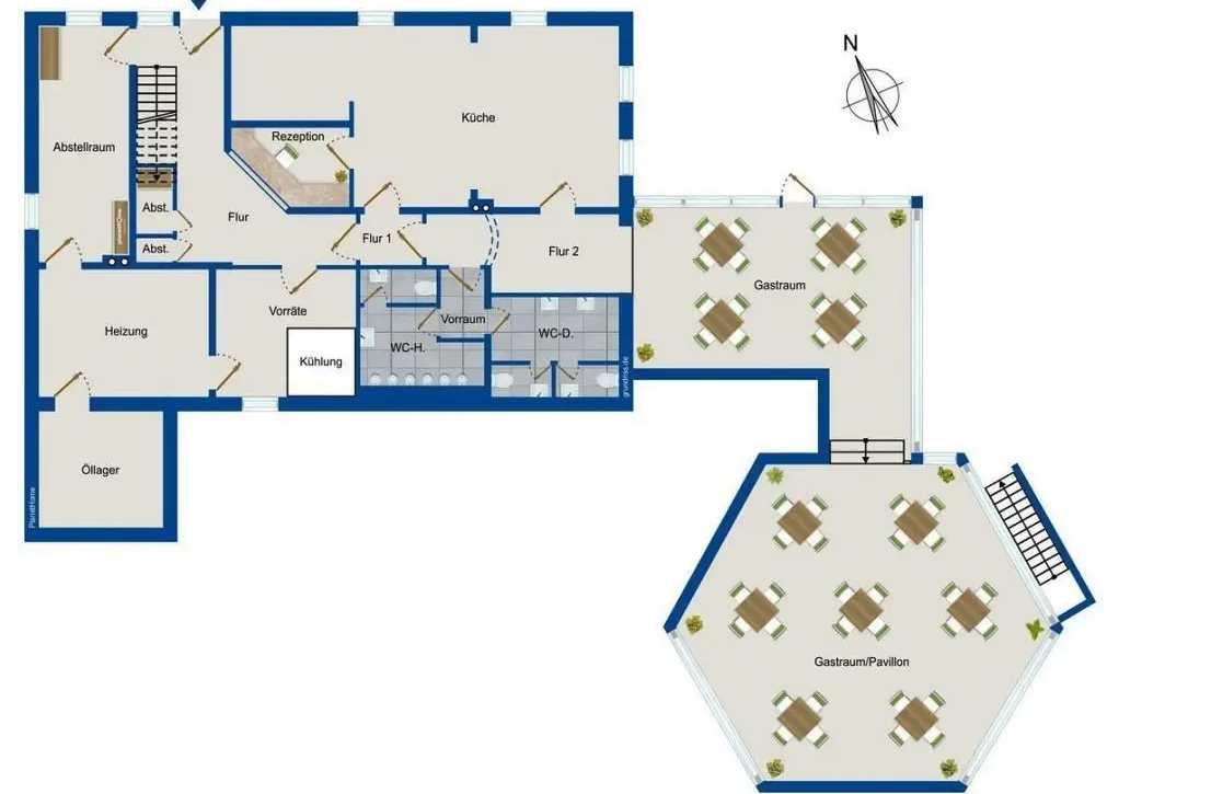 Přední restaurace sloužící jako snídaňová restaurace nabízí další venkovní posezení s krásným výhledem na Sybilenbad a Chebský les. K nemovitosti patři 2 garáže, zahradní domek s nadzemním bazénem , který se může předělat na wellnes zónu a 15 parkovacích míst.