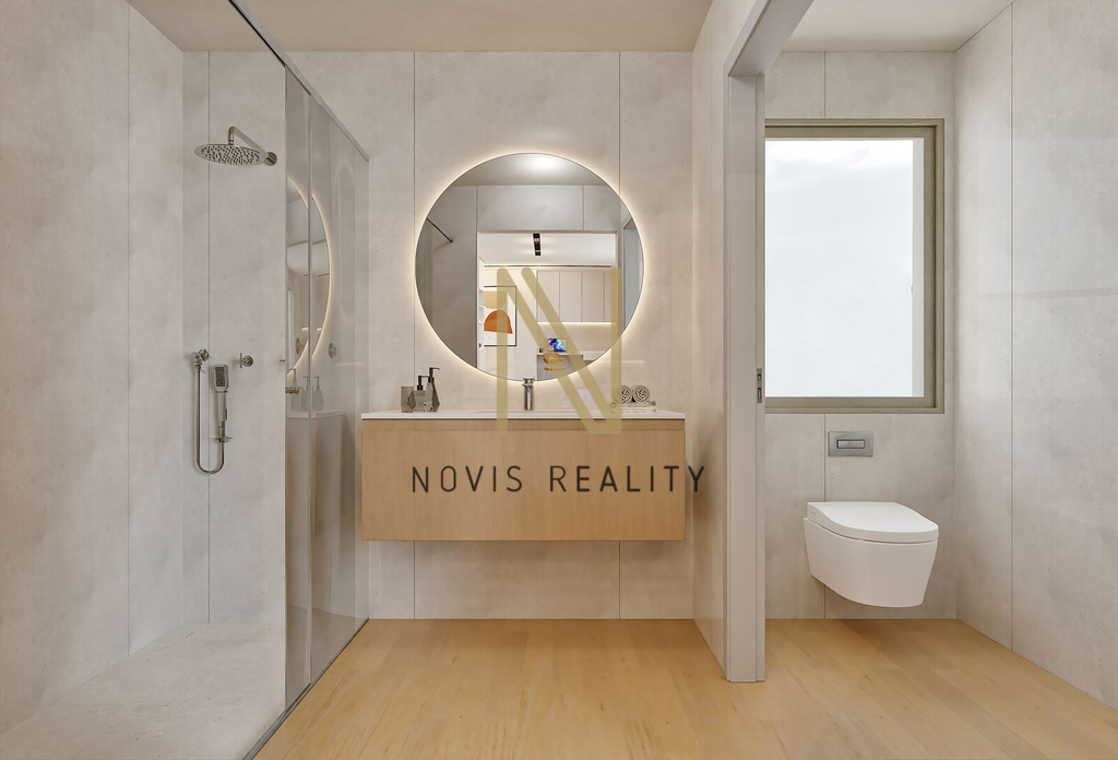 Interiérové vybavení: velkoformátové porcelánové podlahy v obytných prostorách, laminátové podlahy v ložnicích, keramická dlažba v koupelnách, lakované hliníkové dveře a okna s dvojitým zasklením, motorizované žaluzie, kuchyně s vestavěnými spotřebiči (lednice, indukční deska, trouba, myčka), moderní toalety s porcelánovými umyvadly a chromovými bateriemi