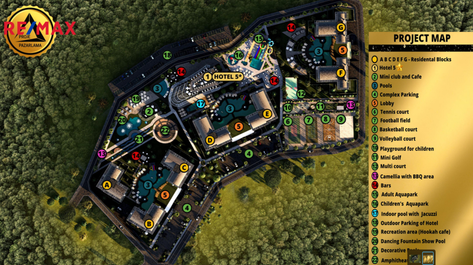 Představují byt v unikátním luxusním komplexu, který se nachází v chráněné oblasti, uprostřed jehličnatého lesa, nedaleko růžové písečné pláže. V okrese Avsalar na severu Alanye a je považován za jednu z nejkrásnějších oblastí. Projektová oblast zajímá - 52.000 m2 se vzdáleností k moří - 900 m. Začátek stavby - 30.06.2023 a konec 30.06.2025 roku. Na území se nachází luxusní 5tihvězdičkový hotel s bohatou infrastrukturou, kde je zajištěno vše pro pohodlný pobyt: bazény, vodní plochy, fitness, lázně, park, sportovní a zábavní prostory, lobby, recepce, ostraha a mnoho dalšího. Majitelé v obytném komplexu mohou používat celou hotelovou infrastrukturu.