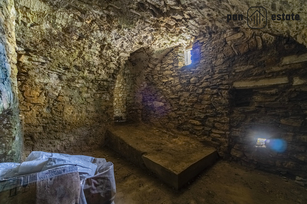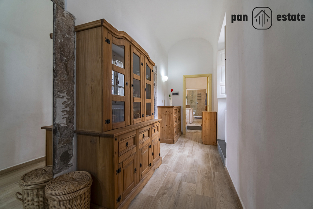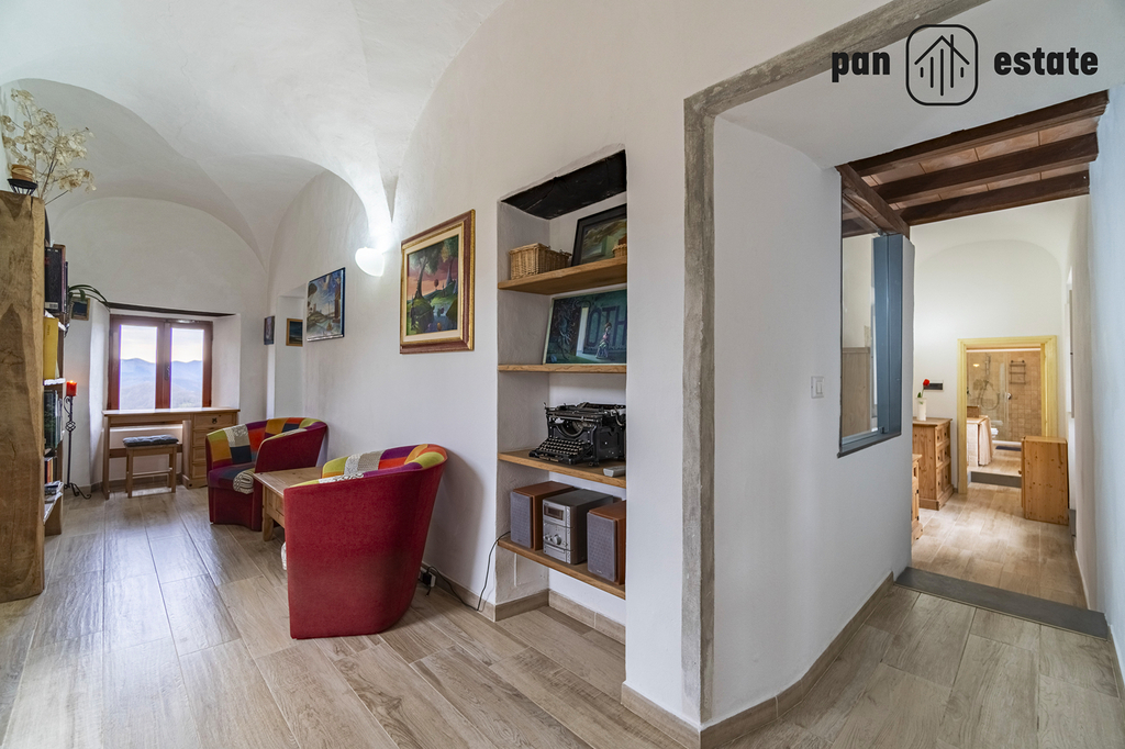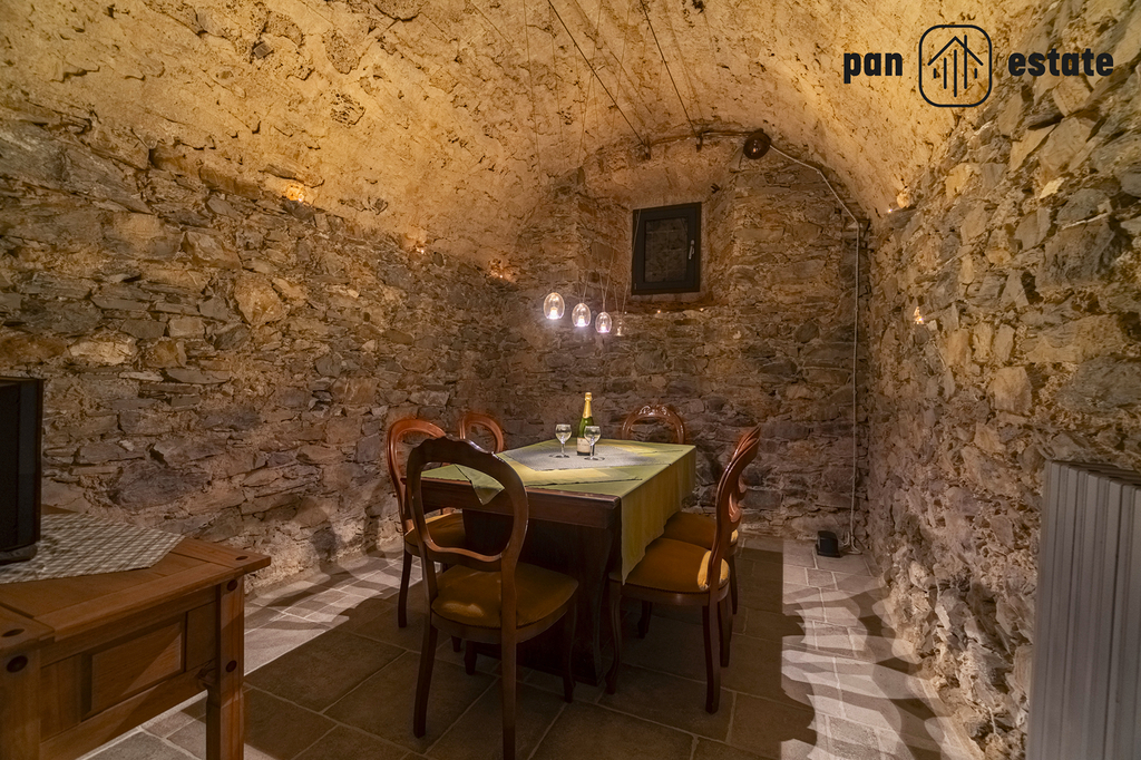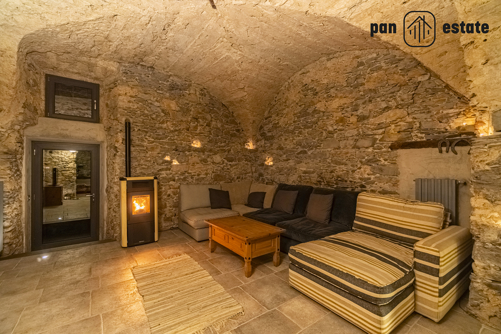 Jednotka v přízemí (cca 157 m²): také se samostatným vstupem, zahradou a terasou s grilem, kuchyň, koupelna, ložnice, po kamenném schodišti se dostanete do úžasné jídelny a obývacího pokoje s klenutými stropy.