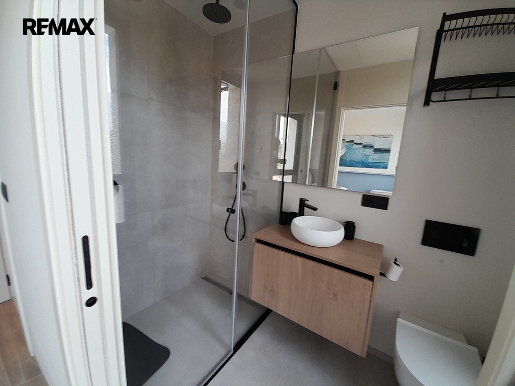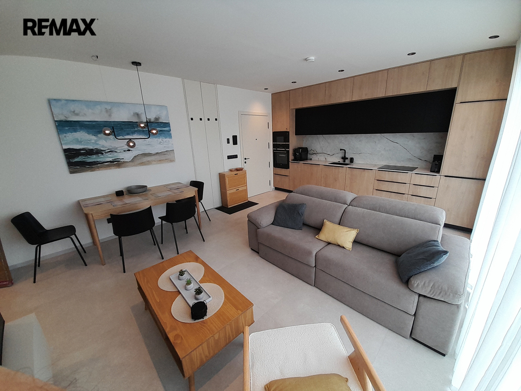 Tento slunný a moderně zařízený apartmán disponuje dvěma ložnicemi s oddělitelnými lůžky, dvěma koupelnami s podlahovým vytápěním, prostorným obývacím pokojem s QLED televizí a plně vybavenou kuchyní se špičkovými spotřebiči. Dominantou bytu je impozantní terasa o výměře 28 m² s výhledem do okolí, ideální pro odpočinek i posezení s přáteli – třeba při venkovním grilování.