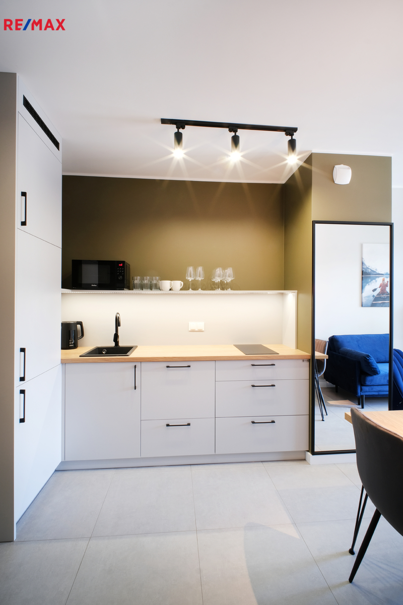 Apartmán se nachází ve 2NP. Developerem byl dokončen na klíč s užitnou plochou 31 m² a balkonu 10 m². O teplotní pohodu se stará podlahové topení, v létě oceníme venkovní dálkově ovládané žaluzie. Plně vybavená kuchyně s vestavnou lednicí, myčkou, varnou deskou, mikrovlnou troubou a také veškerým nádobím. Obývací pokoj má rozkládací sedací soupravu a televizi. Ložnice taktéž plně vybavena. Koupelna se sprchovým koutem a toaletou. Vše co budete potřebovat se zde již nachází.