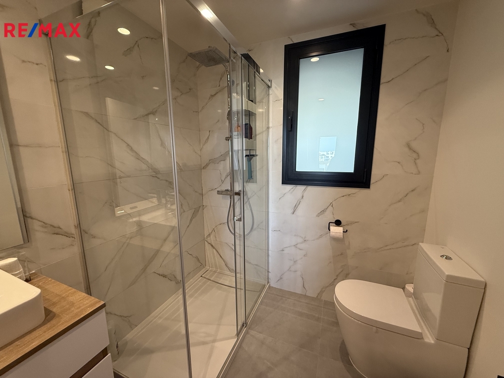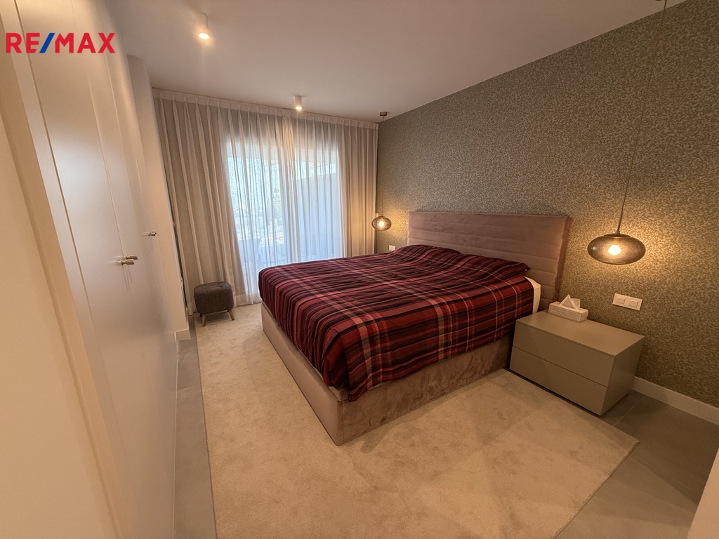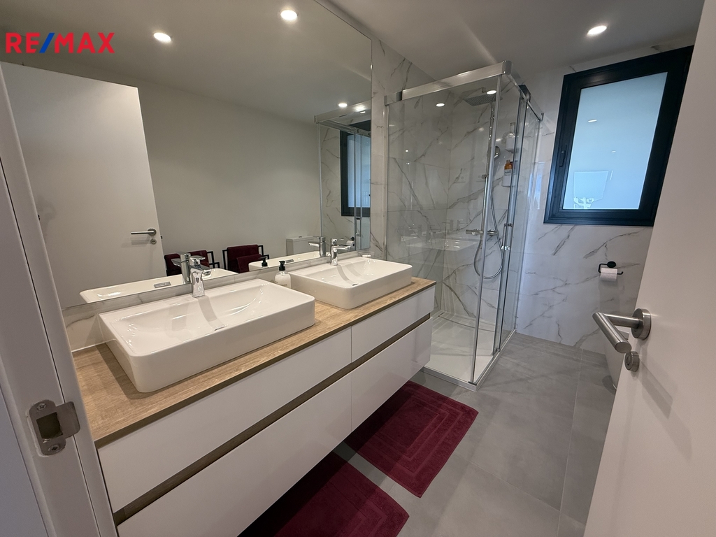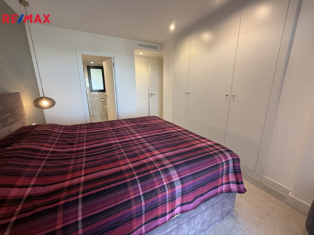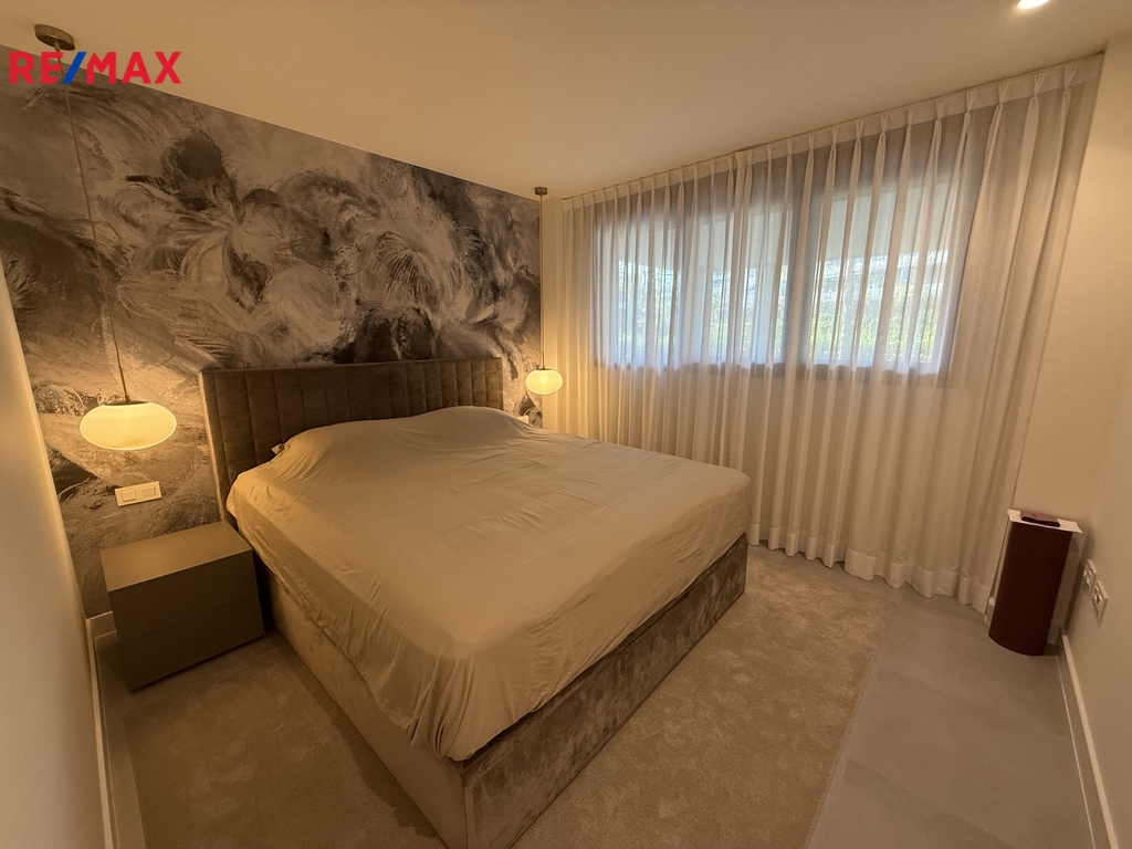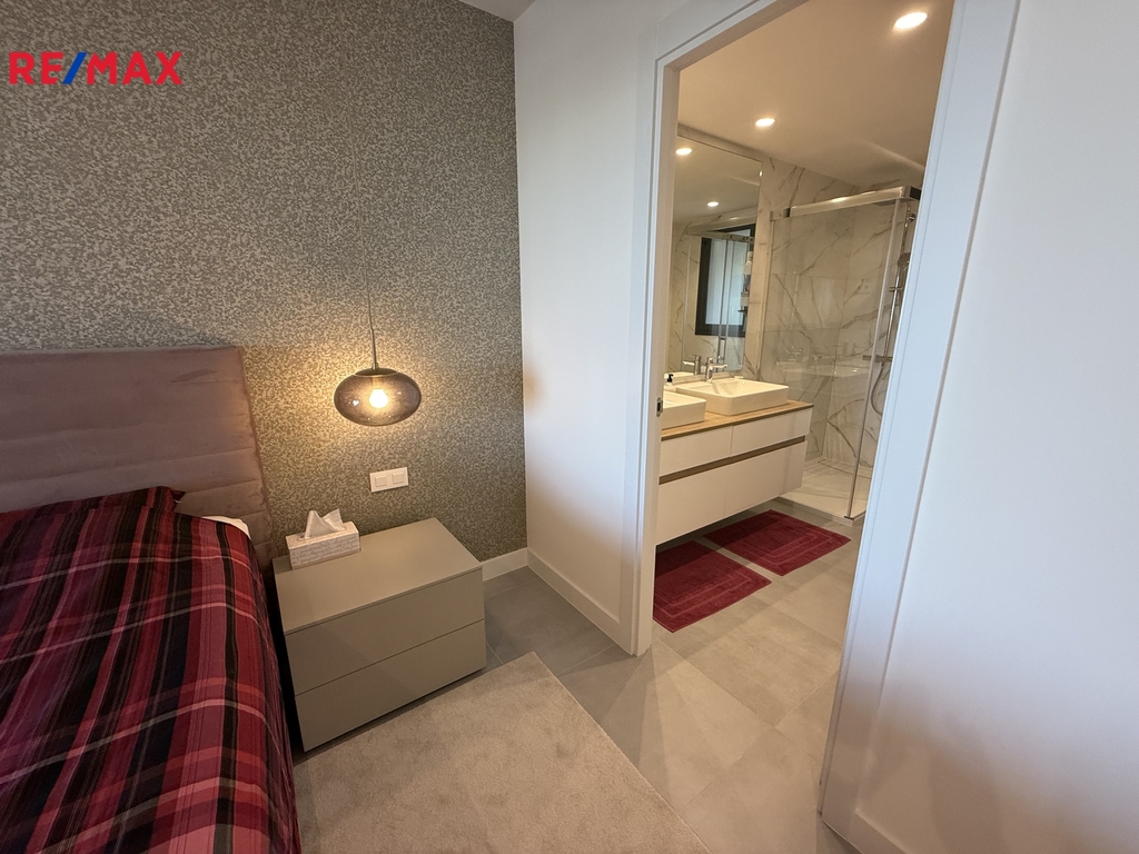 Hlavní ložnice má výjimečně také přímý vstup na terasu a nádherné výhledy na moře. Druhá ložnice je rovněž velkoryse navržena. Každá ze 2 moderních a designově minimalistických koupelen má walk-in sprchový kout. Celý apartmán má zařizovací prvky a doplňky vysoké kvality. Vkus a dostatek přirozeného světla dodává atmosféře na luxusu.