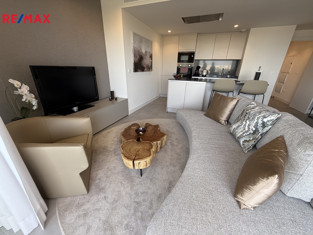 Interiér bytu má (102 m²) a navazuje přes posuvné dveře přirozeně na prostornou terasu (28 m²) s nejžádanější jihozápadní orientací. Otevřený elegantní obytný prostor je spojený s plně zařízenou kuchyní s moderním ostrůvkem splňuje požadavky moderní funkčnosti a komfortu.
