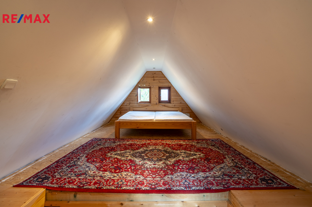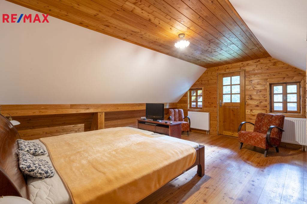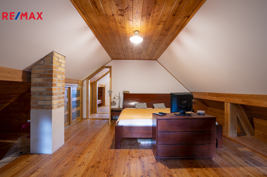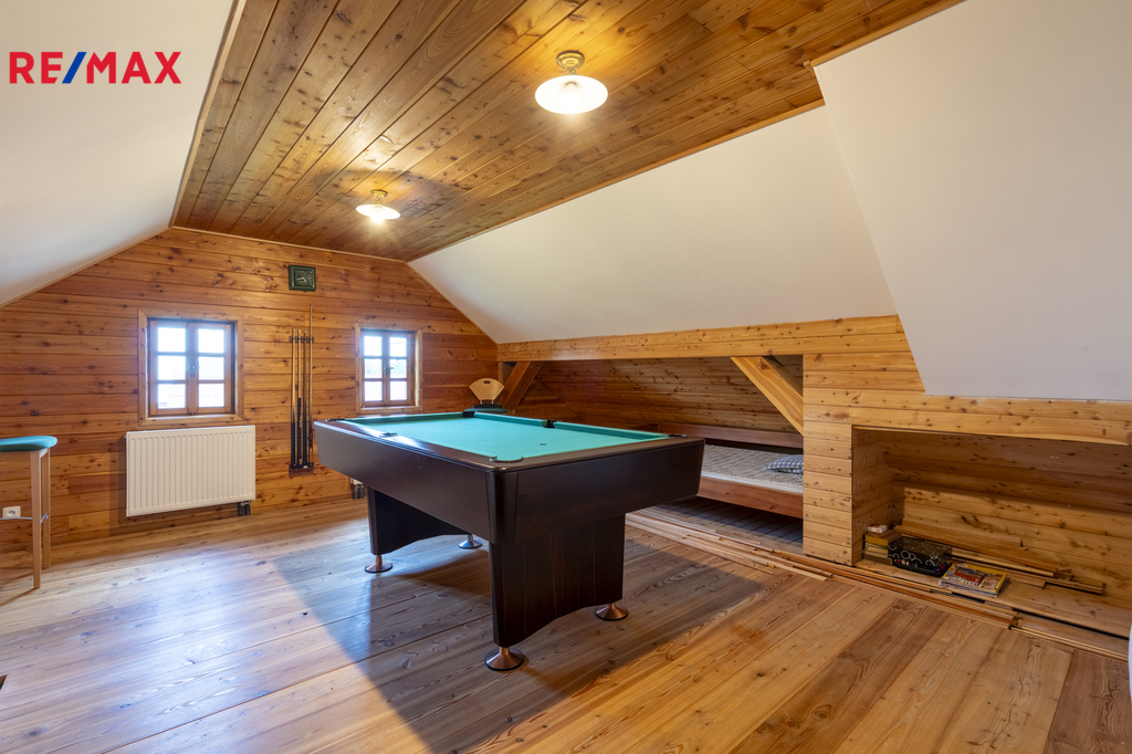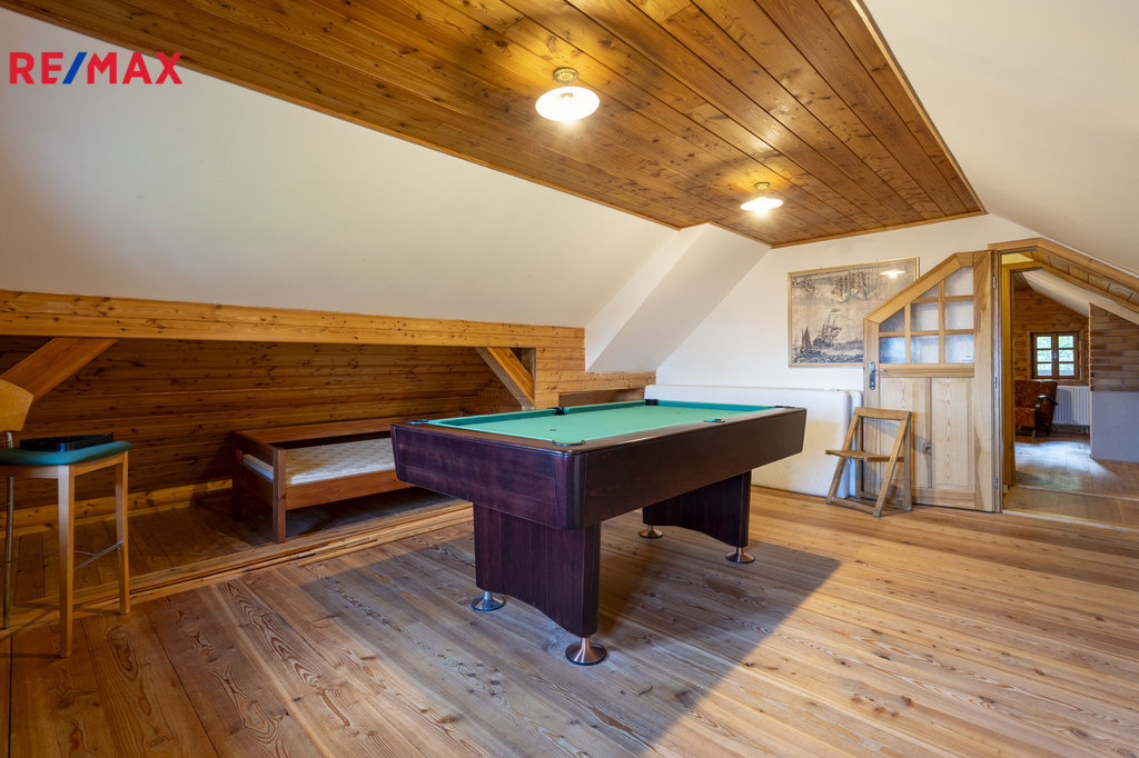* komfortní ložnice a herna s biliardovým stolem, oba pokoje mají úložné prostory v šikminách