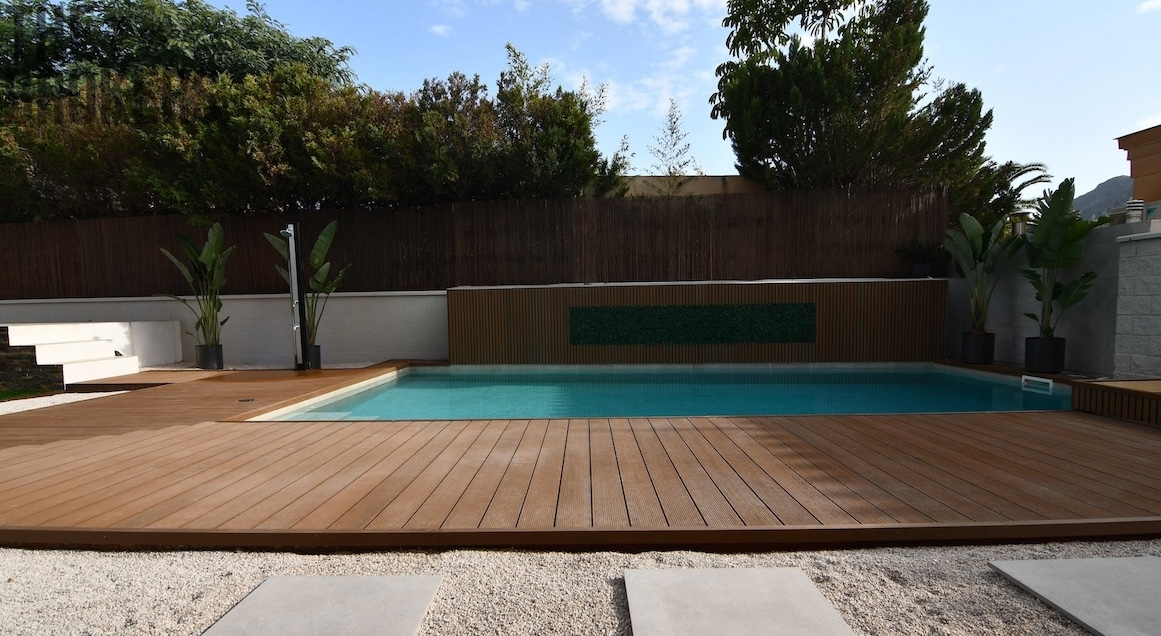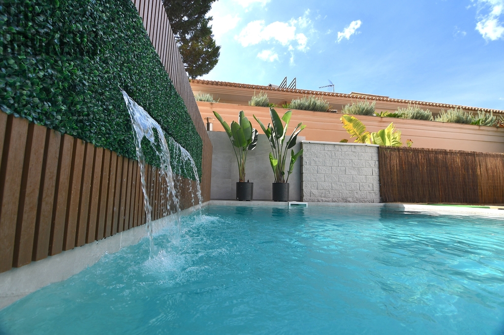 Venkovní oáza s nádherným bazénem s porcelánovými dlaždicemi, vodopádem, krytou terasou s kompletní kuchyní a ohništěm.
