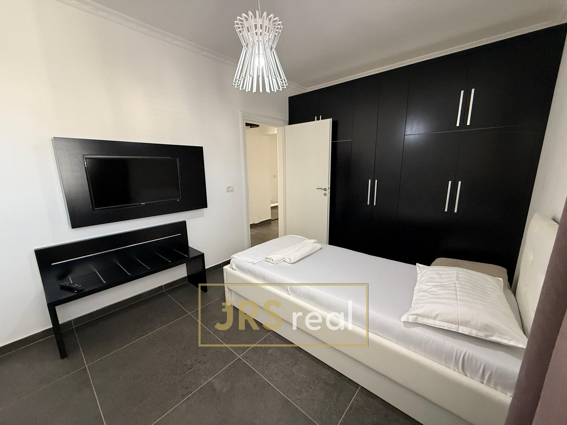 administrativou, tepelnou izolací a výtahem. Velkou předností bytu je prostorná terasa s nádherným výhledem na moře. Obývací pokoj je vybaven prostornou sedačkou, křeslem, konferenčním stolkem, jídelním stolem se třemi židlemi, TV a nabízí vstup na velkou terasu. Kuchyňská linka je plně vybavena spotřebiči a lednicí. Ložnice disponuje manželskou postelí, křeslem, komodou, TV, šatní skříní a rovněž vstupem na terasu. Druhý pokoj je zařízen dvěma jednolůžkovými postelemi, stolkem, TV a šatní skříní. Koupelna je vybavena sprchovým koutem, umyvadlem se skříňkou, zrcadlem, pračkou a je společná s WC. Součástí dispozice je také praktická úložná místnost, kterou lze využít jako menší šatnu.