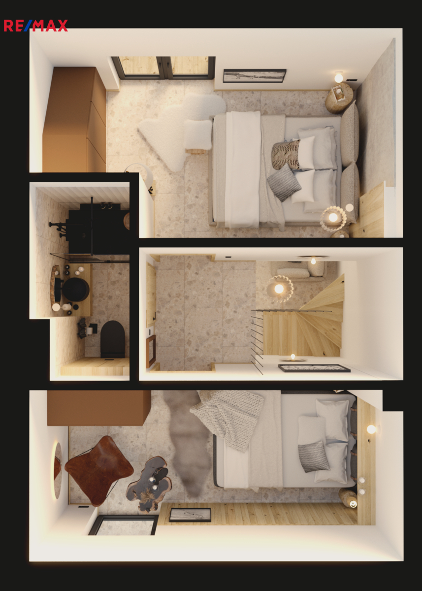 Většina apartmánu je patrová, menší mezonetové. Každý má jinou výměru.