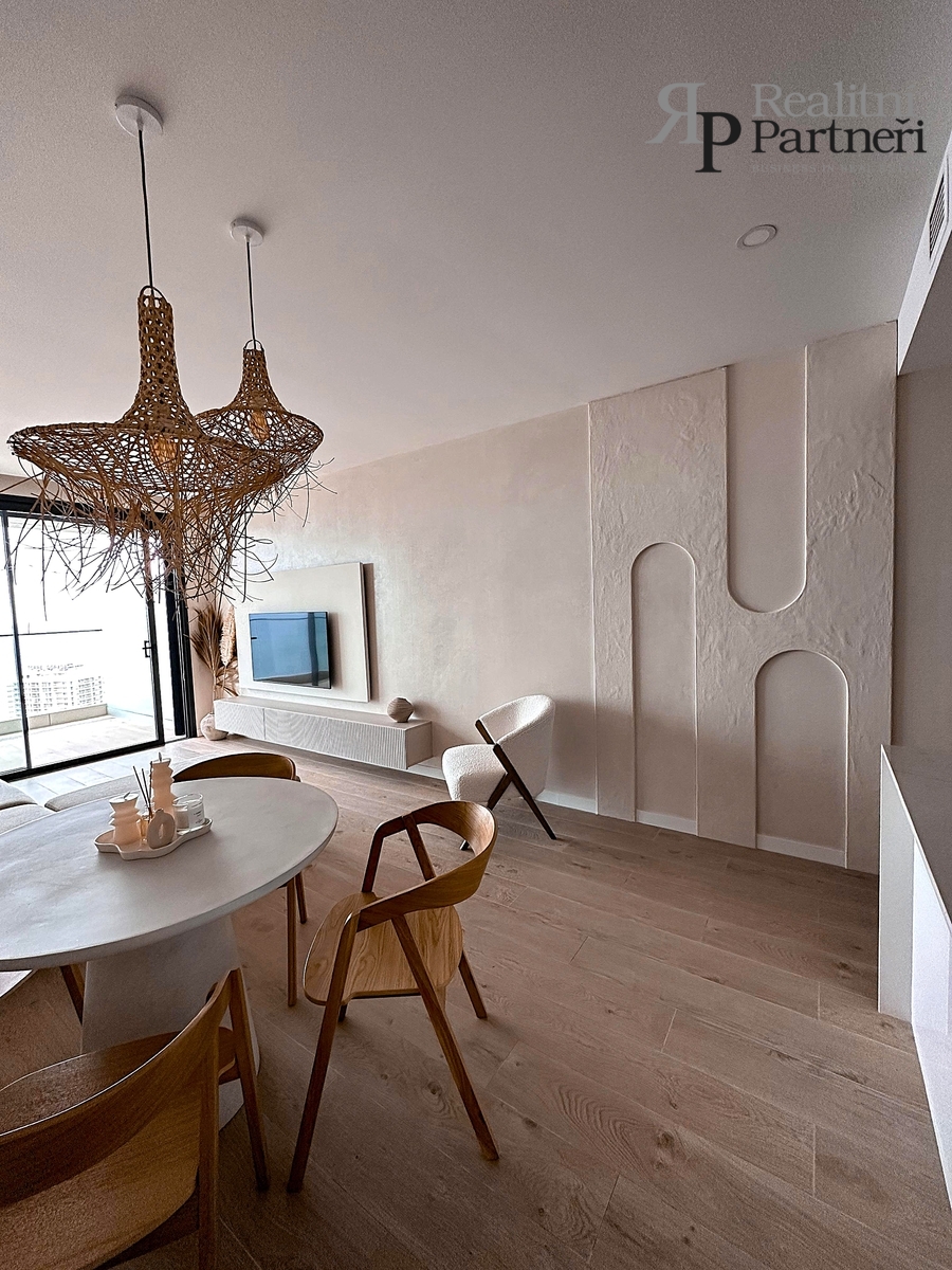 Apartmán se nachází ve 25. patře z 36, s celkovou podlahovou plochou 103,63 m² a nabízí úchvatné panoramatické výhledy na okolí, ale hlavně na Středozemní moře a město. Prostorná terasa tyto výhledy ještě umocňuje, každý den si můžete užívat slunce a mořský vánek v absolutním soukromí.