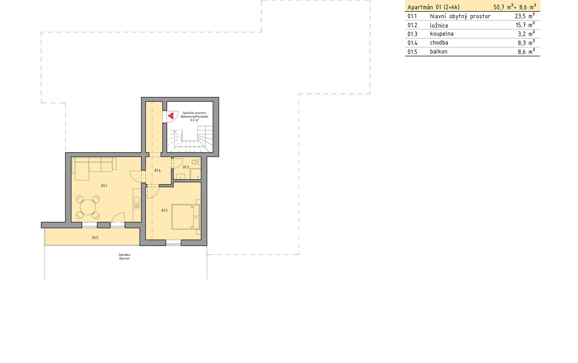 2+kk 50,7 m² + lodžie 8,6 m2 , terasa 200