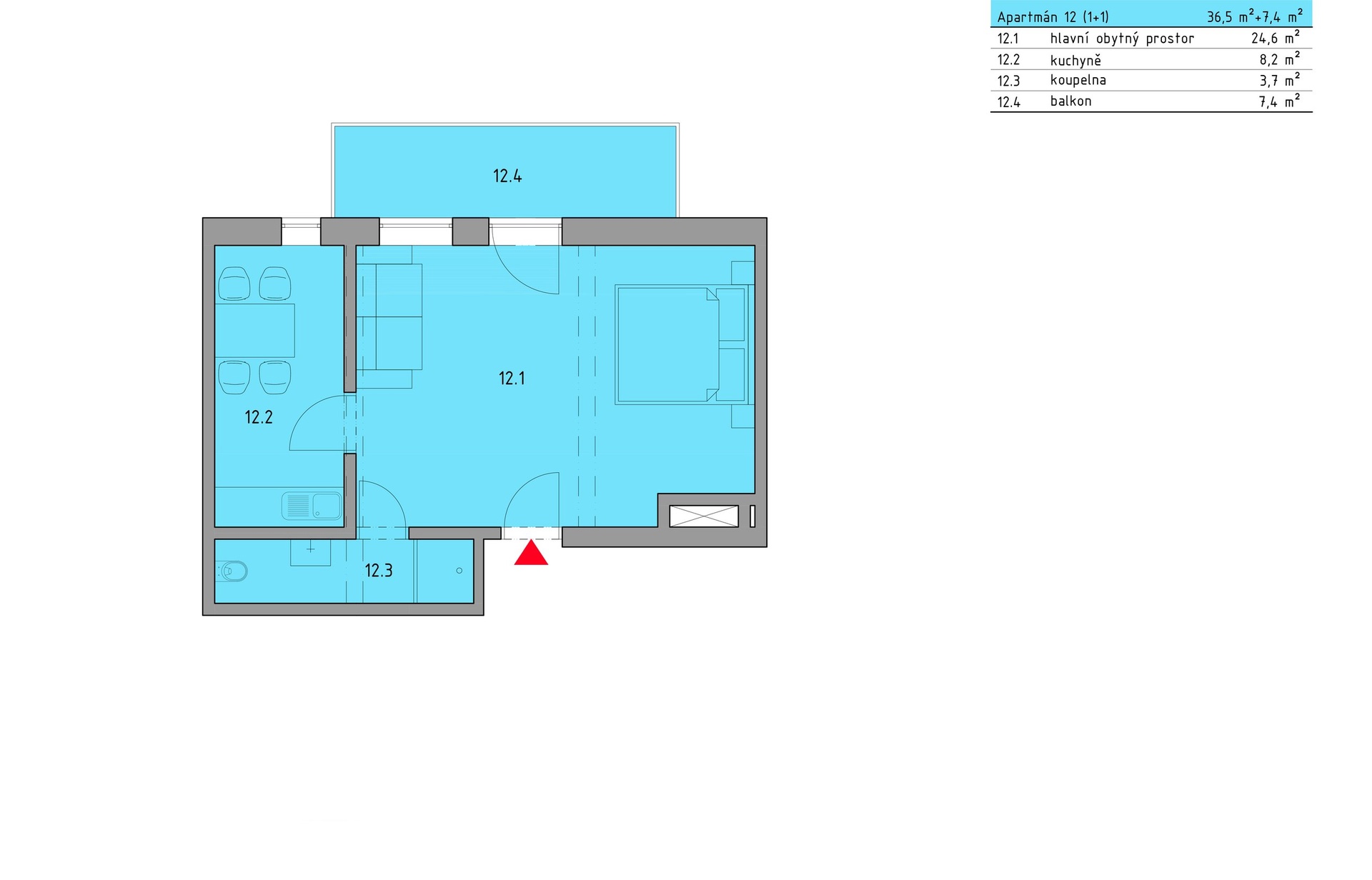 1+1 36,5 m² + balkon 7,4 m2 + parkovací stání, sklepní kóje - dle vlastního výběru
