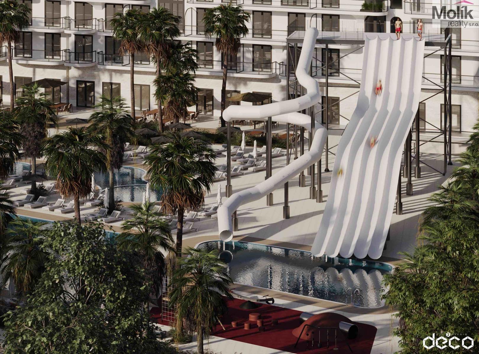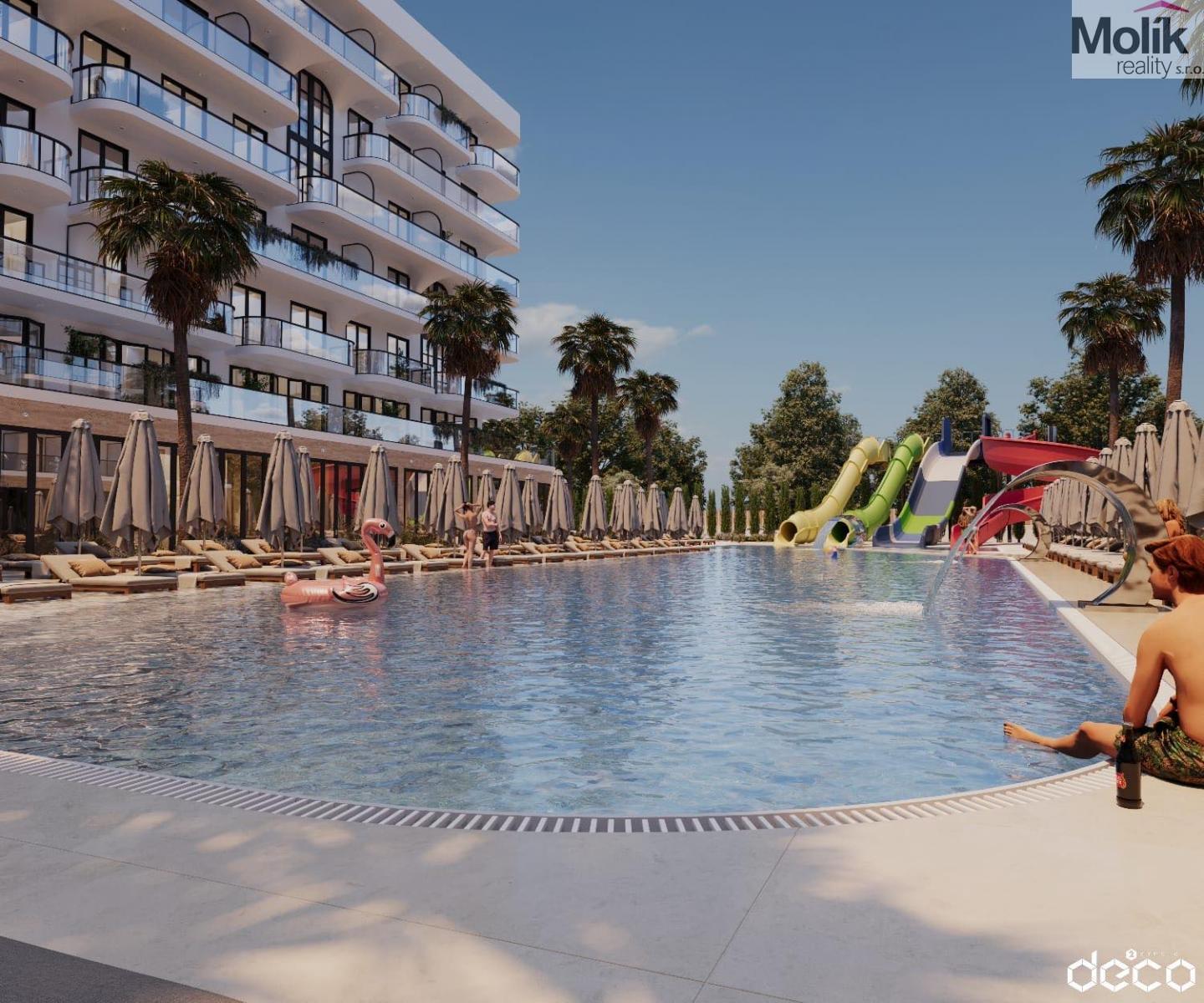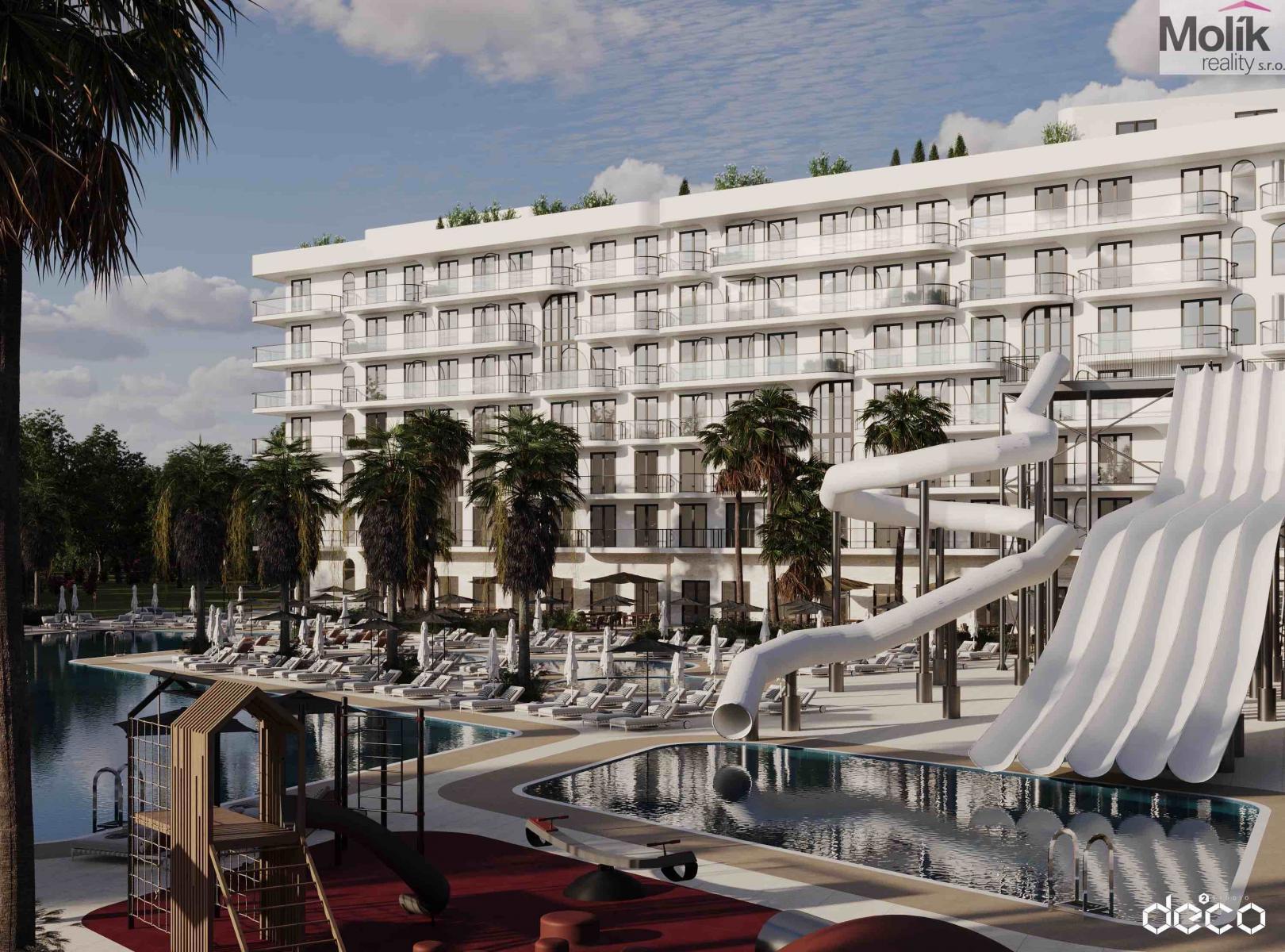 Moderní resortový standard: 5 bazénů, aquapark, hotel, bar a restaurace v rámci komplexu, vše pro váš komfort.