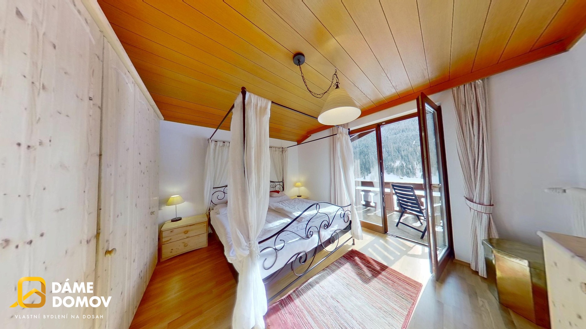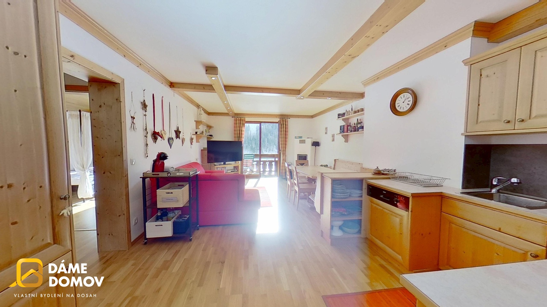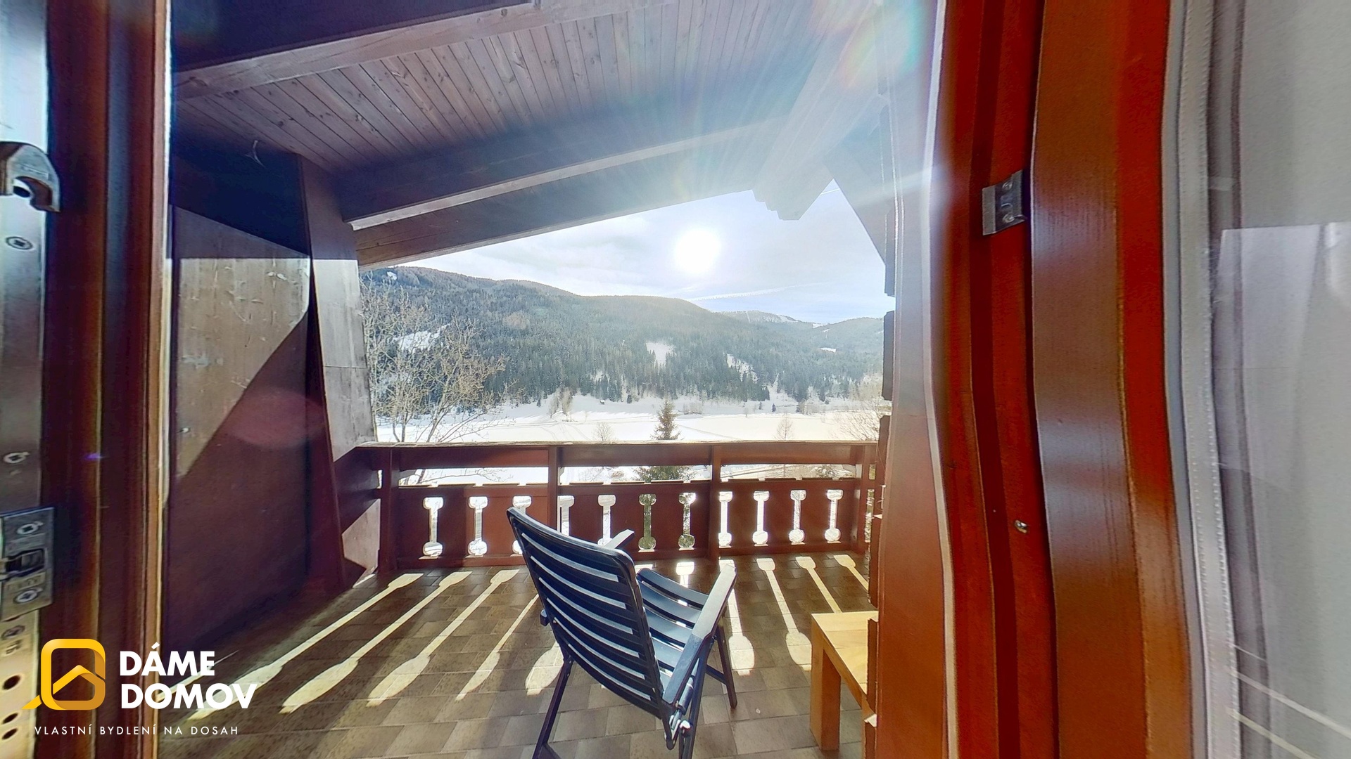 o podlahové ploše 77 m² se nachází v klidné části obce a nabízí krásný výhled na okolní hory. Součástí je balkon o velikosti 11 m² – ideální místo pro ranní kávu či večerní posezení po dni na sjezdovkách. K apartmánu náleží podzemní garážové stání a jedno venkovní parkovací místo.