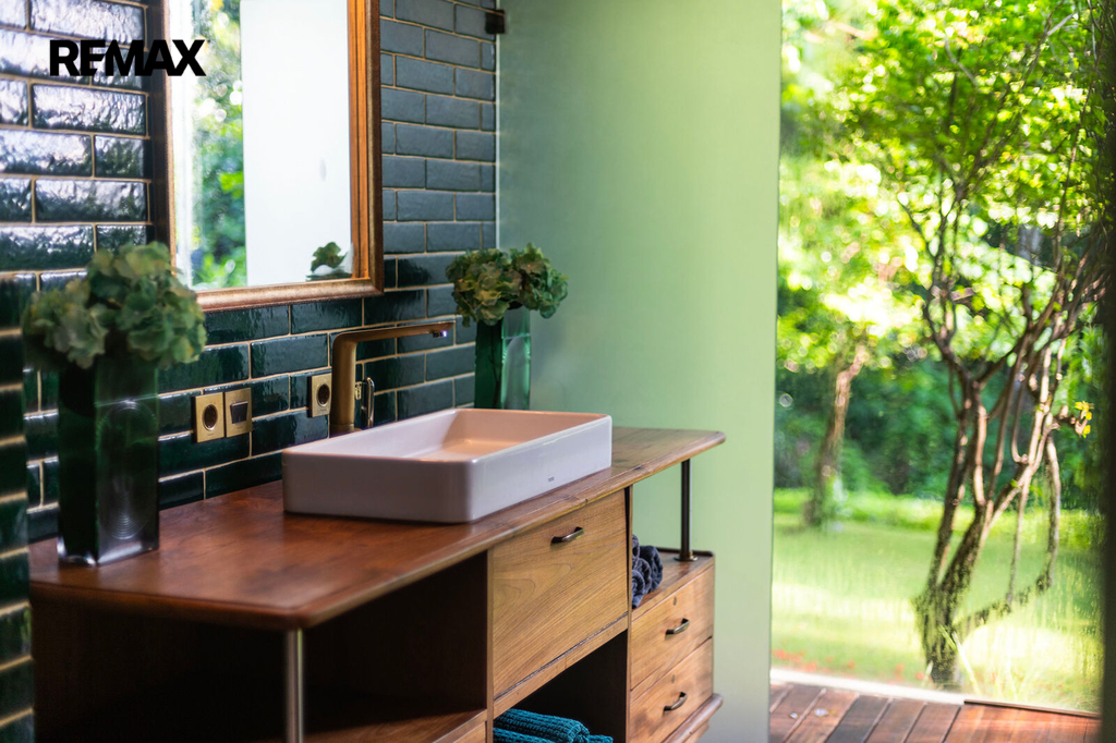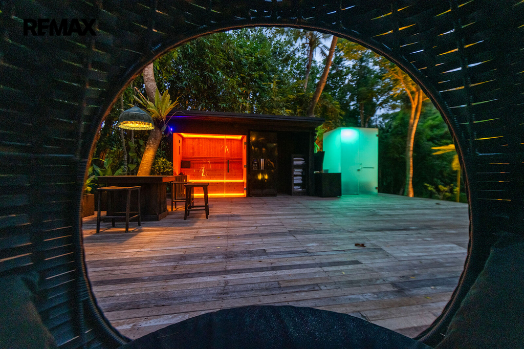 Zahrada jako z pohádky – plná palem, kapradin, stromů i tichých zákoutí, kde můžete meditovat, odpočívat nebo jen pozorovat ptáky. K tomu terasa s venkovním sezením, letní kuchyně, večerní světla podtrhující romantickou atmosféru a naprosté ticho – jen šumění větru a přírody.