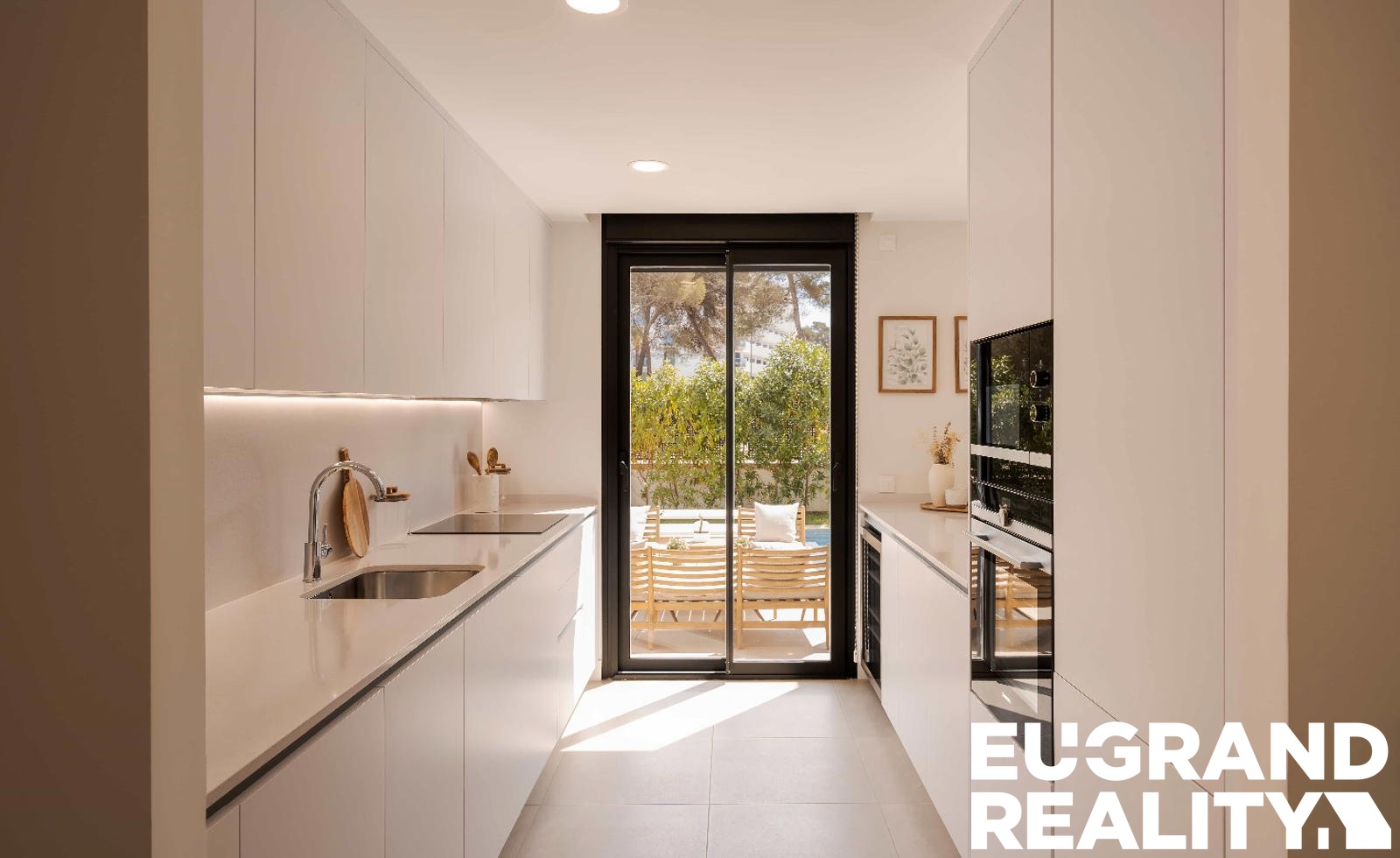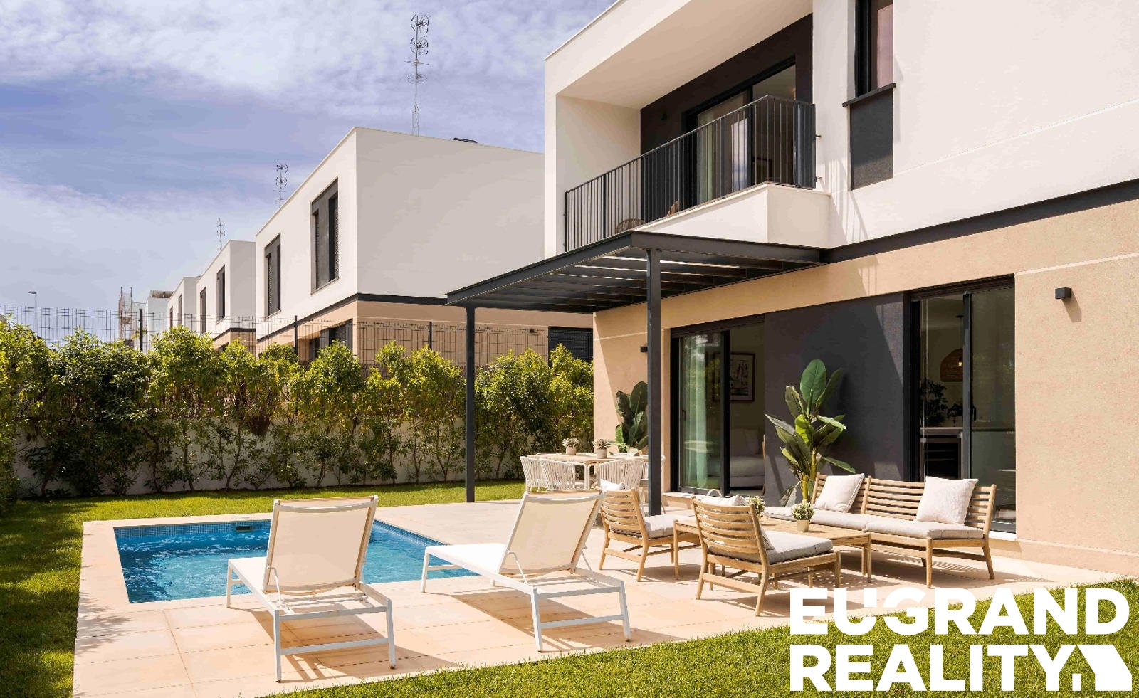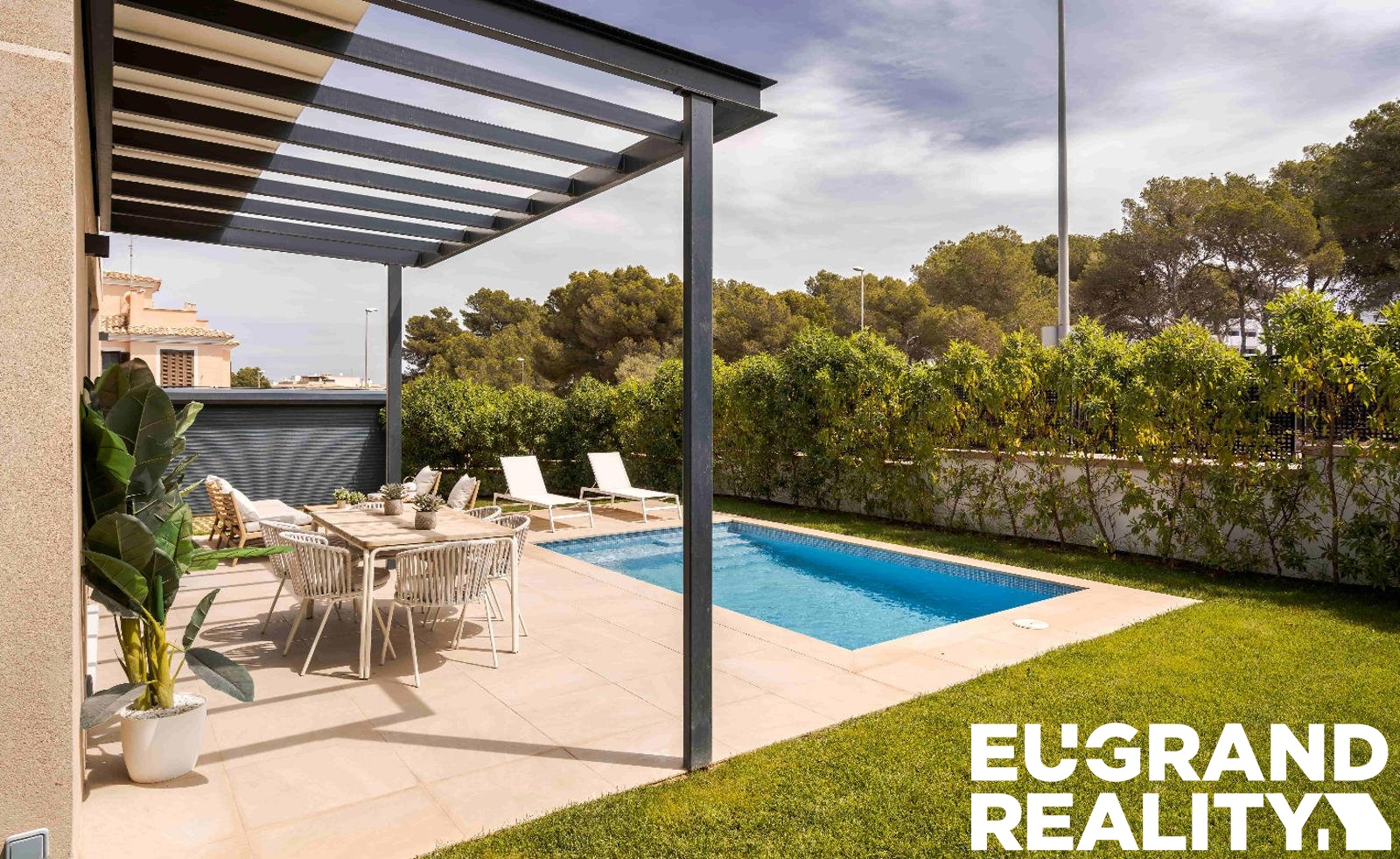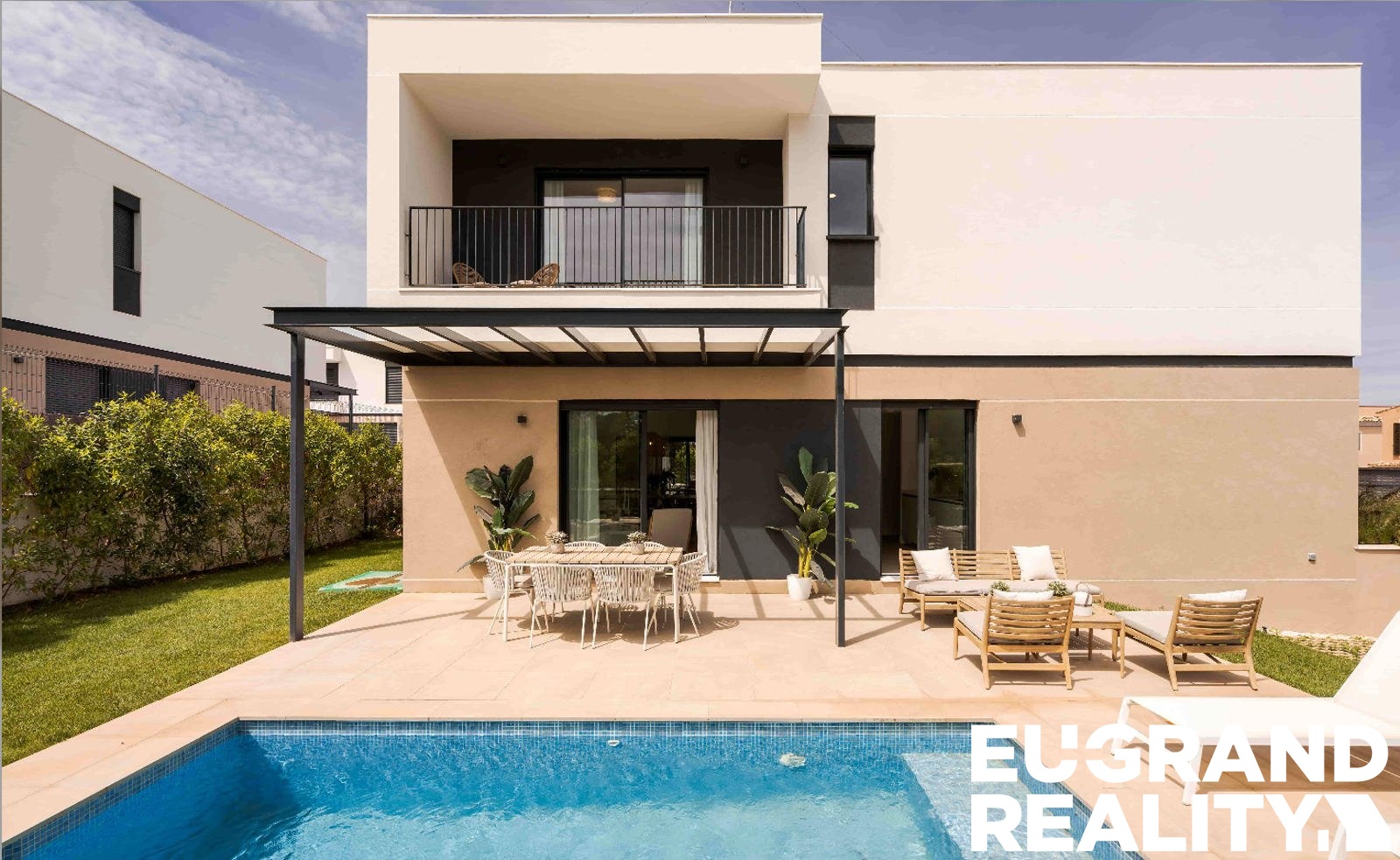 Součástí nemovitosti je soukromý bazén, zahrada a garáž. Dům je vybaven klimatizací, bezpečnostními elektrickými roletami a prodává se kompletně zařízený.