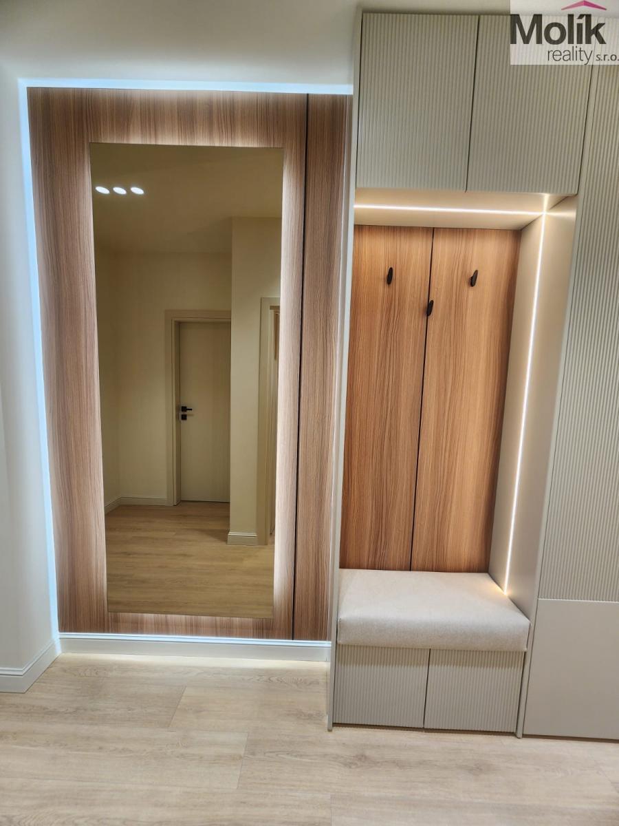 Koupelna: Koupelna disponuje walk-in sprchovým koutem, podsvíceným zrcadlem a kvalitní sanitou včetně bidetu.