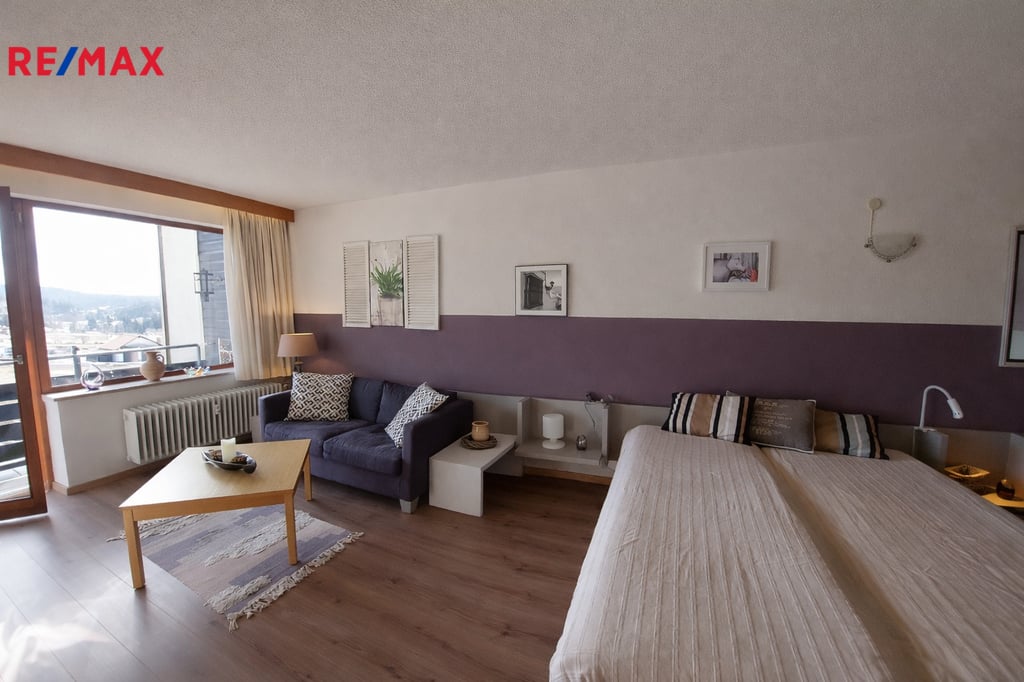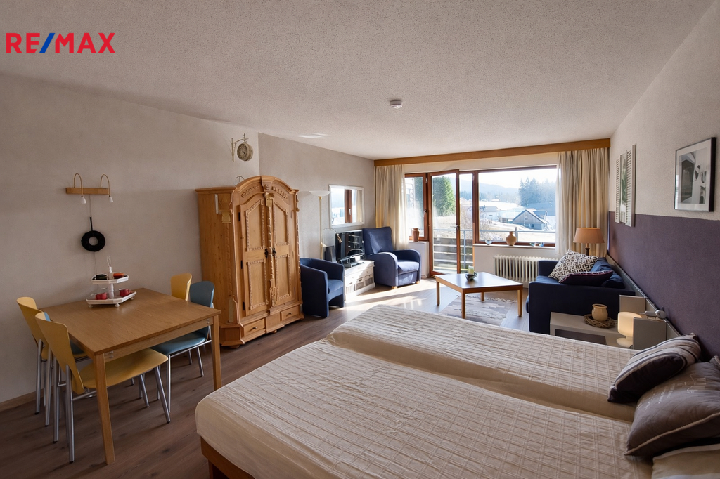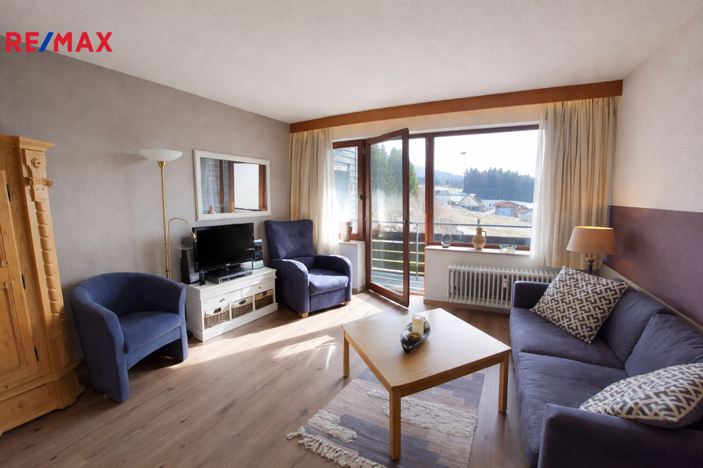 Exkluzivně nabízíme k prodeji apartmánový byt o dispozici 1+kk s výměrou 38 m2 a garážové stání v příhraniční obci Haidmühle na německé straně Šumavy.