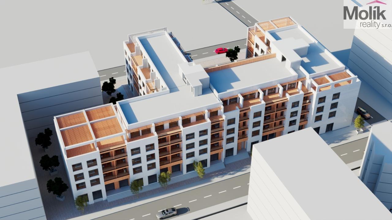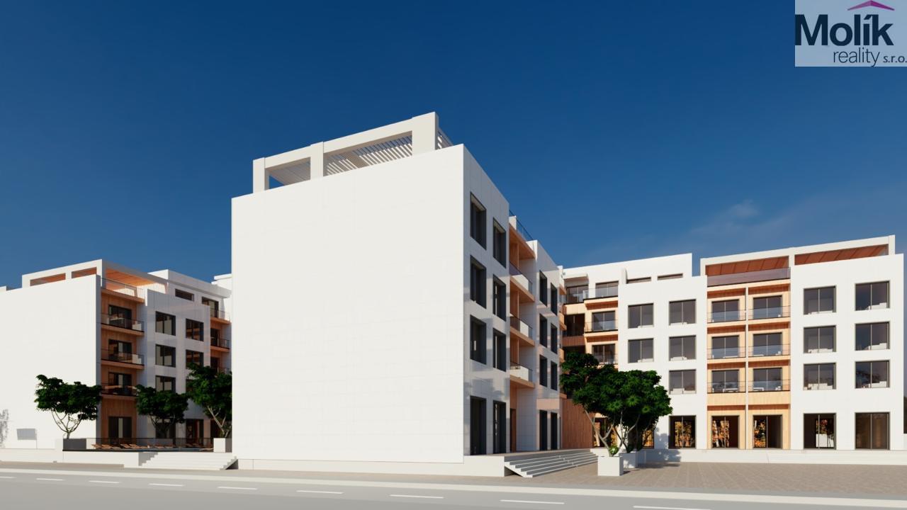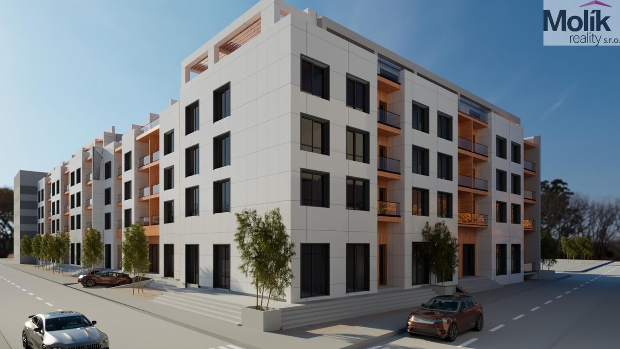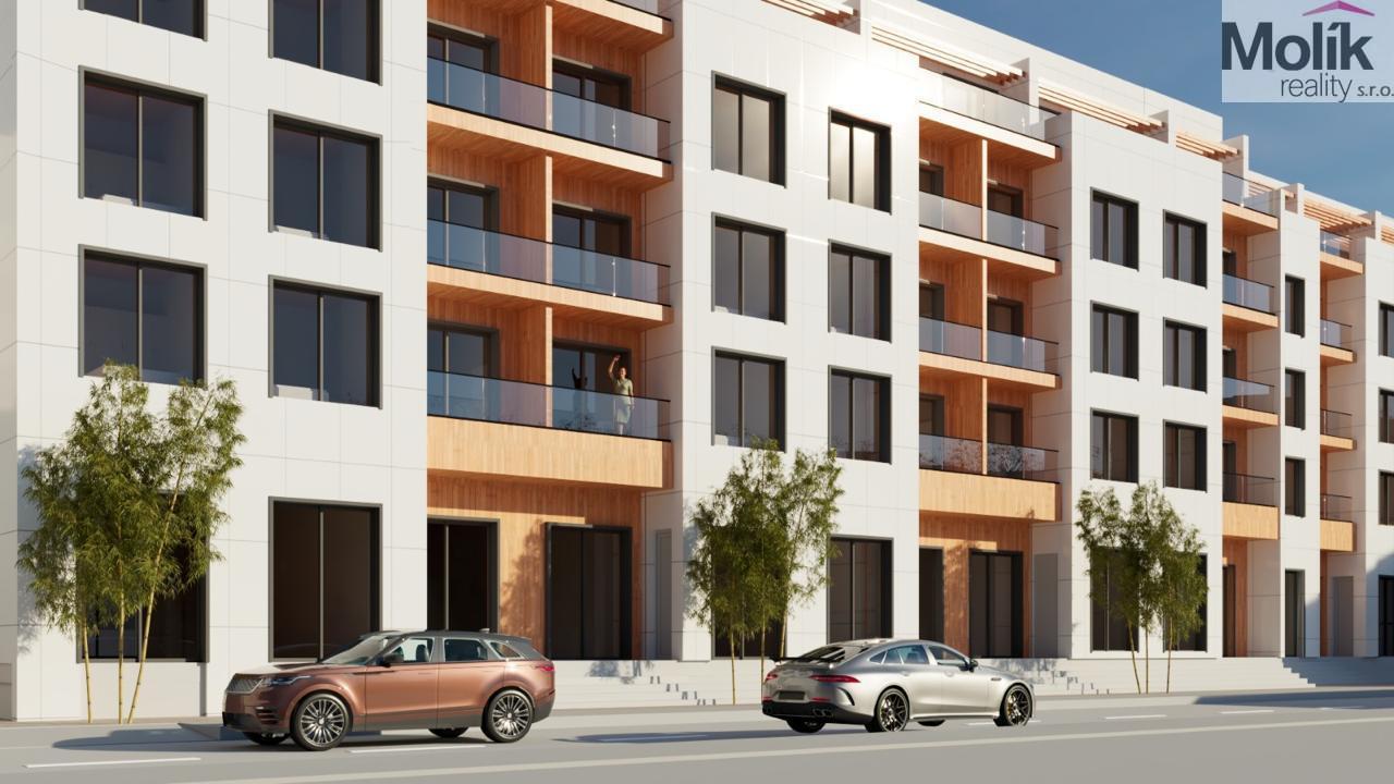Design a kvalita: Fasáda kombinuje moderní hliníkové prvky, skleněná zábradlí na balkonech a dřevěné obklady, které dodávají stavbě luxusní vzhled.