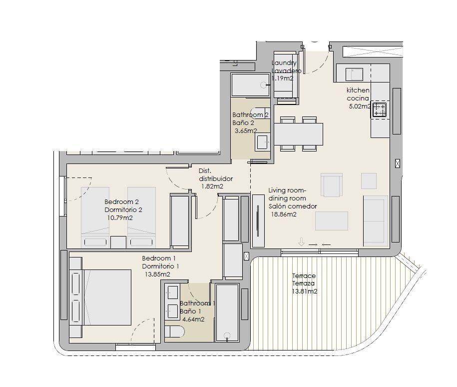 Projekt nabízí moderní apartmány o dispozicích 2+kk, 3+kk a 4+kk. Každá jednotka je navržena s důrazem na funkčnost, komfort a maximální využití přirozeného světla typického pro oblast Costa del Sol.